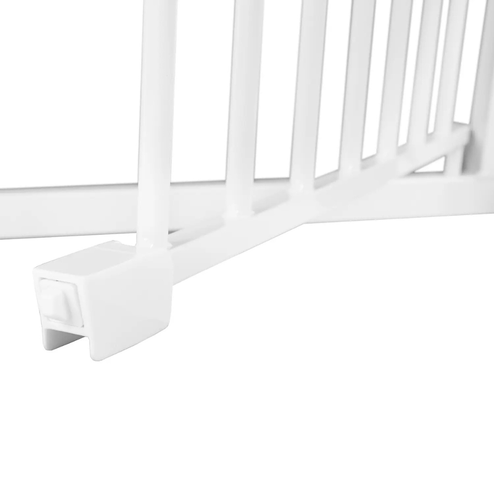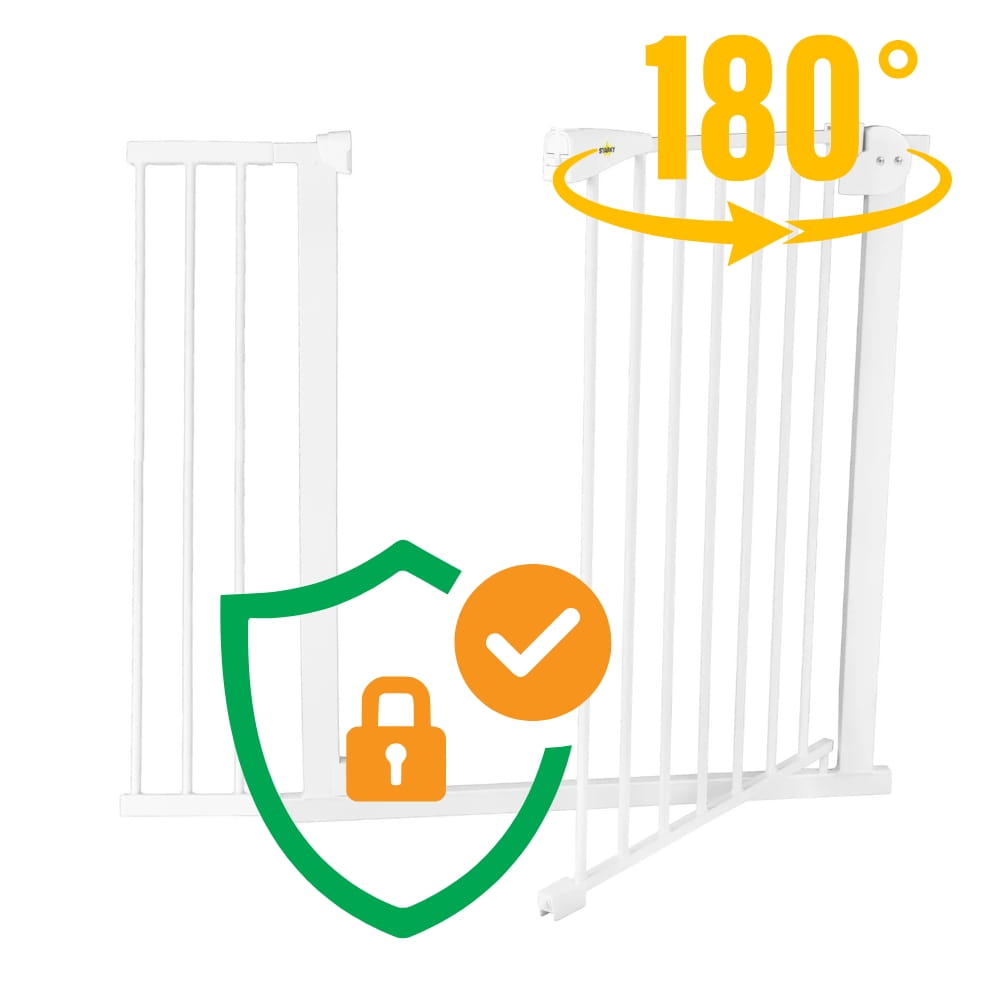 Zastosowany mechanizm blokujący to gwarancja bezpieczeństwa. Bramka otwiera się tylko po użyciu uchwytu zwalniającego sprężynę oraz podniesieniu bramki do góry, co uniemożliwia dziecku lub zwierzęciu przypadkowe jej otwarcie. Dodatkowo, w przypadku lekkiego otwarcia bramka zamyka się automatycznie, na wypadek gdyby ktoś przechodził i zapomniał zatrzasnąć bramkę. Jeśli otworzysz ją szerzej niż 90 stopni, zablokuje się w pozycji otwartej, co jest szczególnie praktyczne podczas przenoszenia przedmiotów. Możliwość otwierania w obie strony zapewnia pełną wygodę użytkowania (180 stopni).