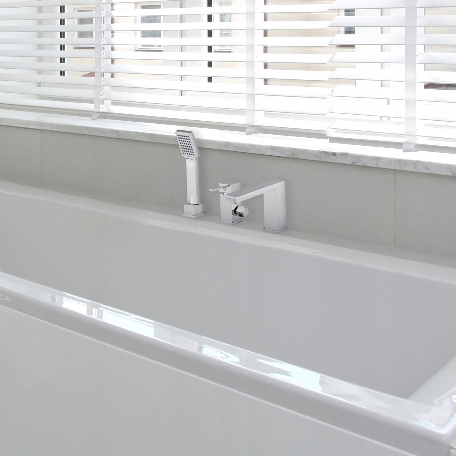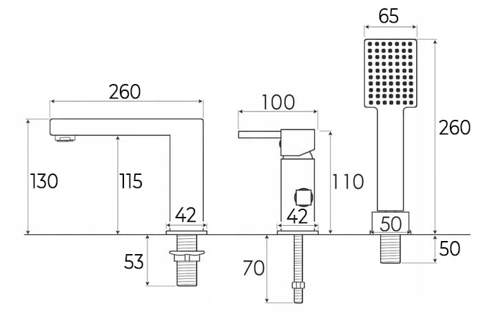 Zestaw z baterią wannową, wylewką oraz słuchawką prysznicową. Zawiera baterię mechaniczną z przełącznikiem strumienia wody wylewka / słuchawka, sztywną wylewkę oraz zestaw natryskowy ze słuchawką prysznicową i wężem 150 cm.