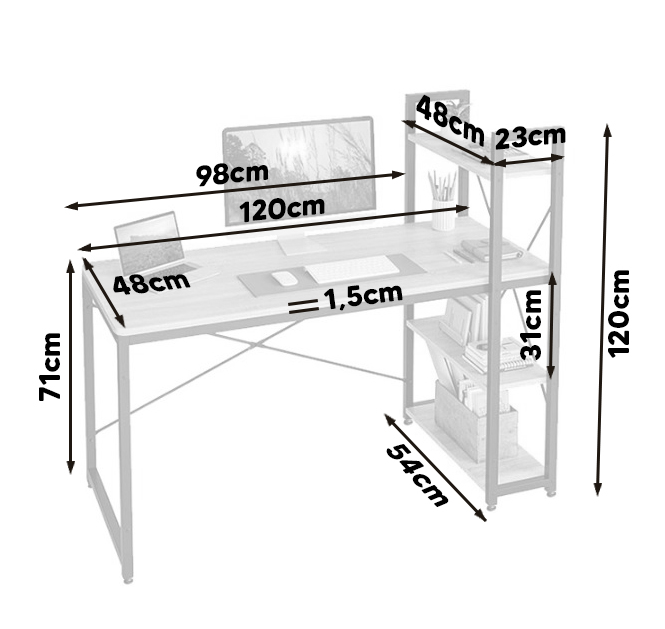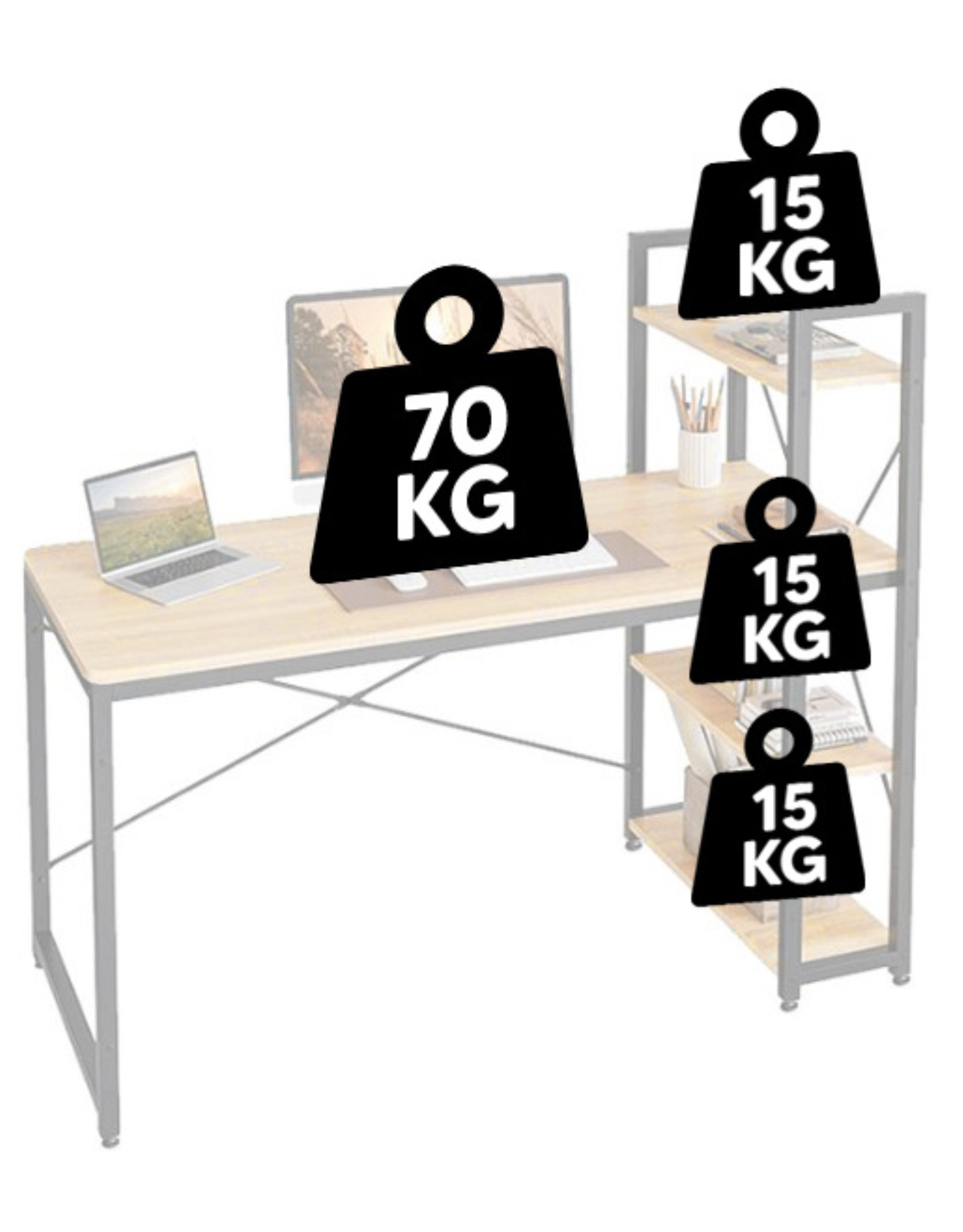✔️ Blat biurka wytrzymuje obciążenie do 70 kg, a każda półka do 15 kg, co zapewnia dużą funkcjonalność i stabilność.