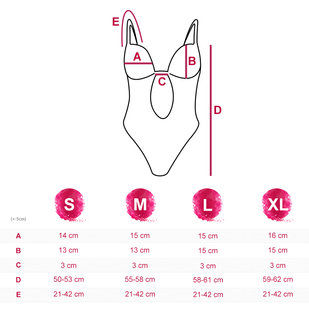 Wraz z body w zestawie znajdziesz dwie pary odpinanych szelek; silikonowe oraz materiałowe w kolorze kostiumu.