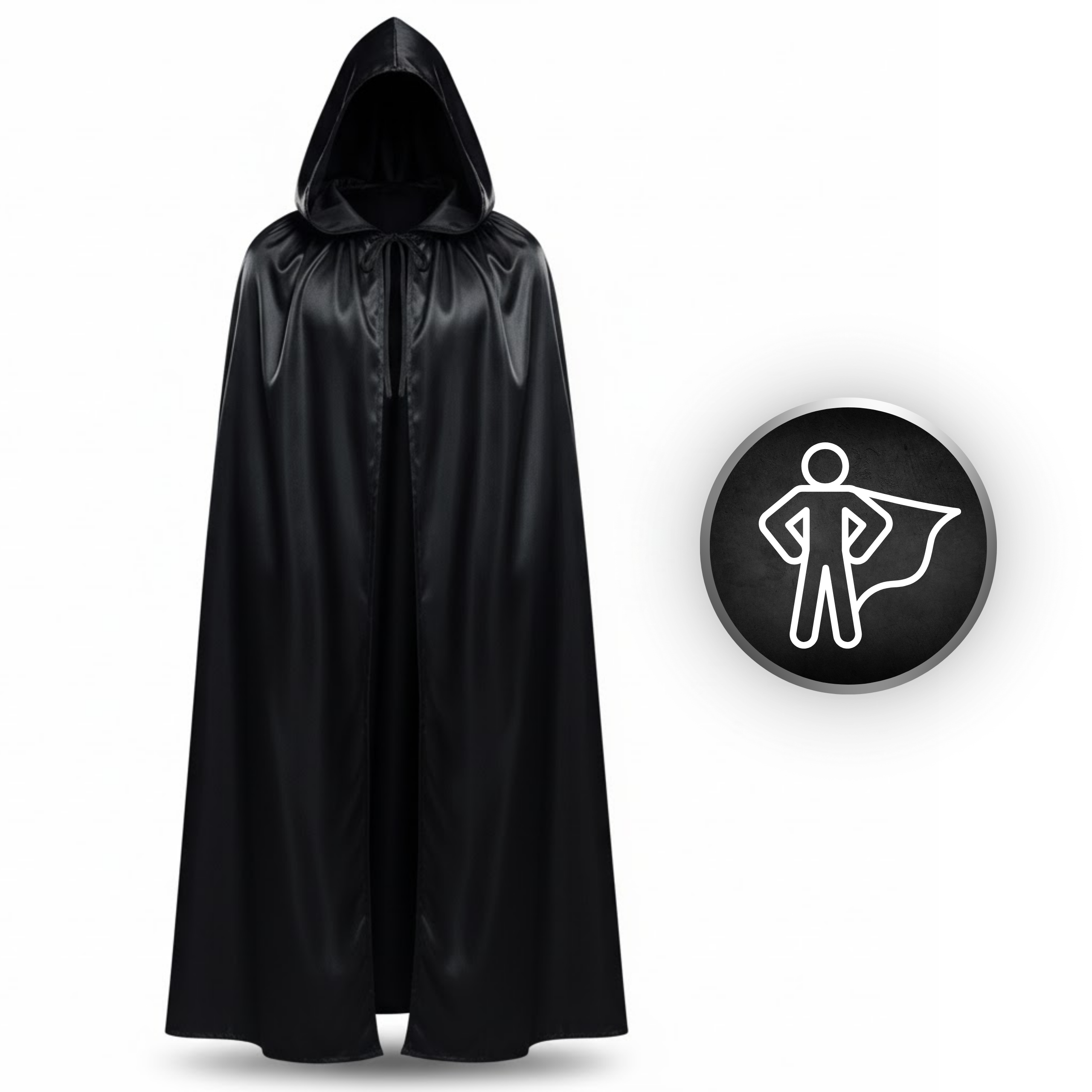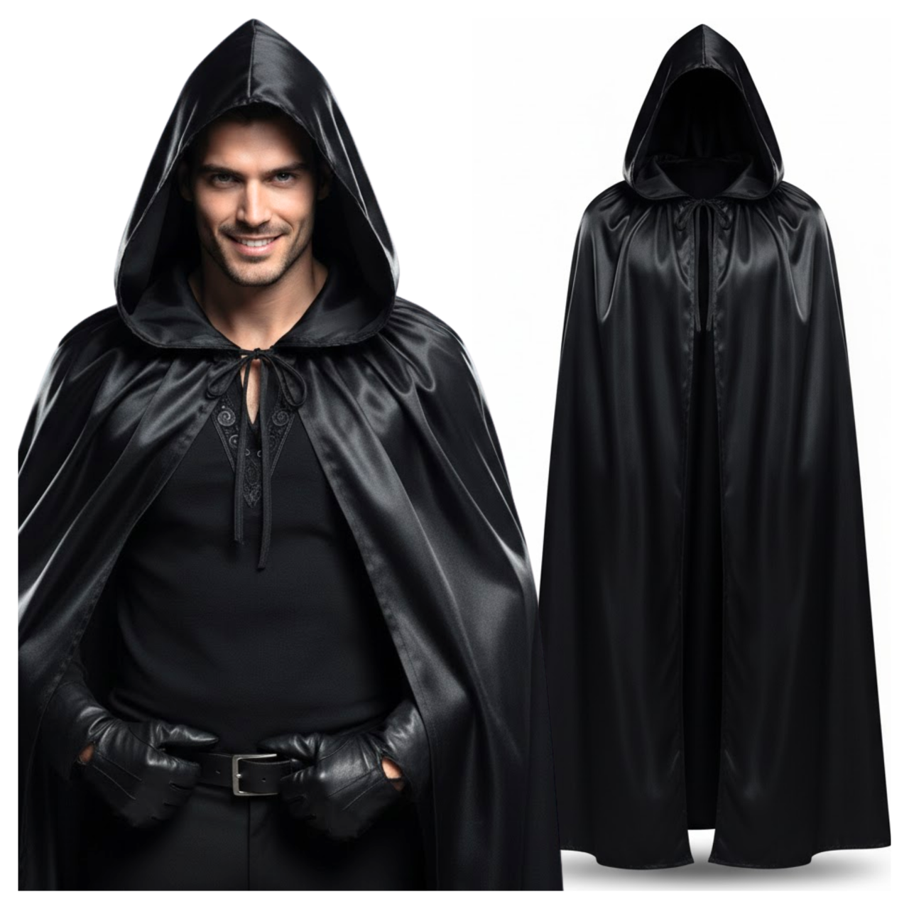 Ta czarna peleryna z kapturem to strzał w dziesiątkę! Wykonana z eleganckiego, połyskującego materiału o satynowym wykończeniu, doda Twojemu kostiumowi tajemniczości, stylu i klasy.
