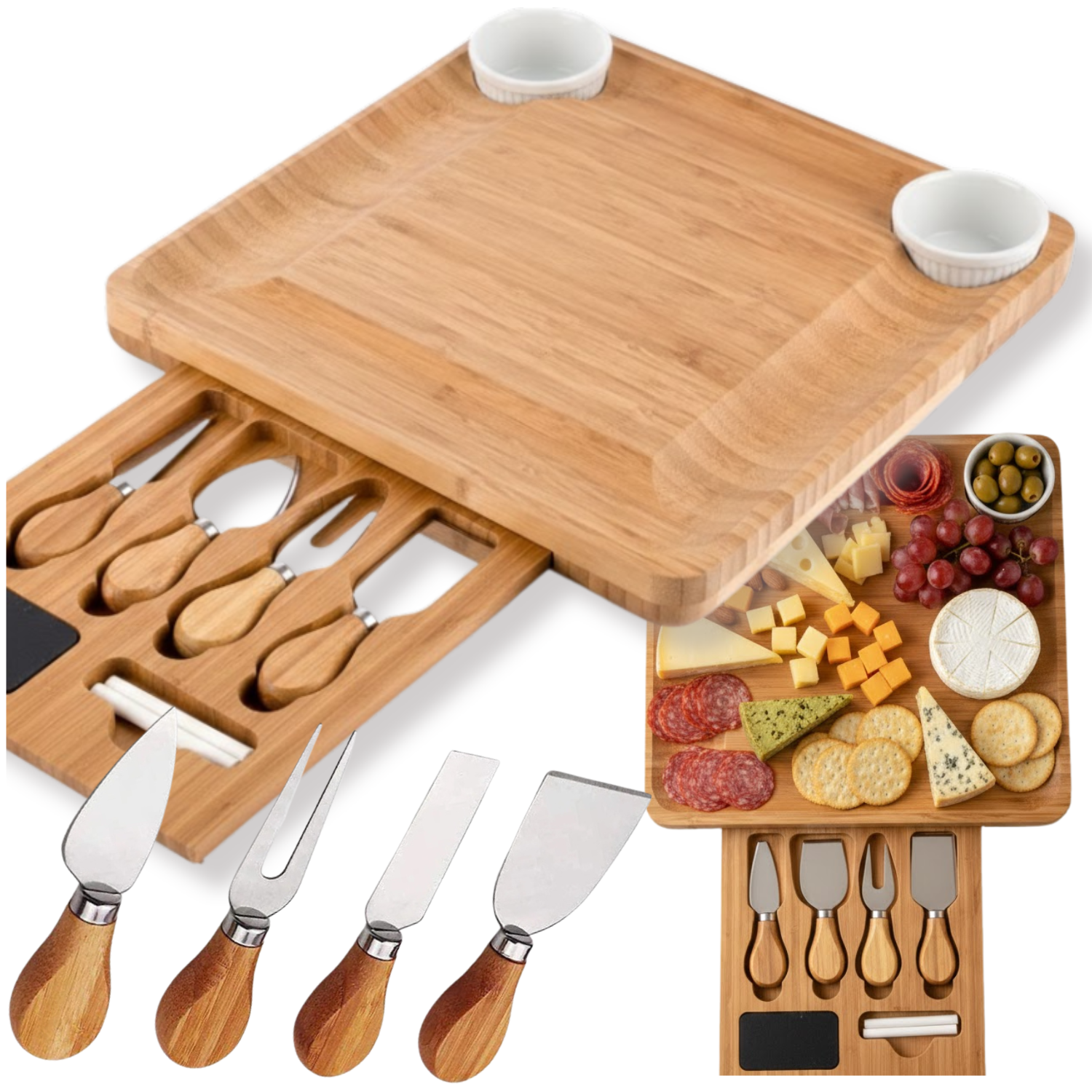 Deska wyposażona jest w szufladkę, która zawiera metalowe akcesoria. Z pewnością ułatwi to nakładanie przekąsek, oraz utrzymanie porządku na stole.