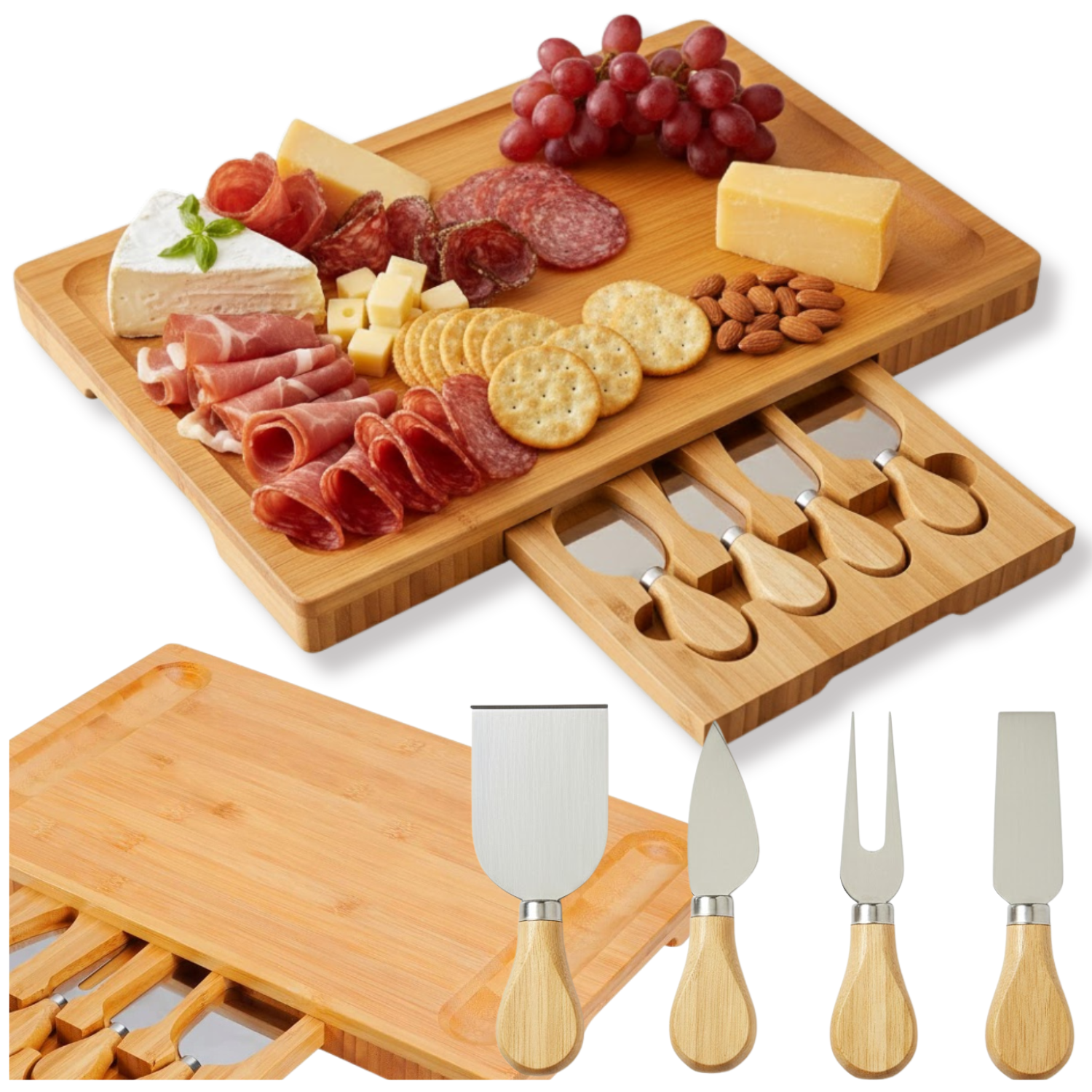 BAMBUSOWA DESKA DO SERÓW, WĘDLIN I PRZEKĄSEK Z ZESTAWEM NOŻY PREZENT