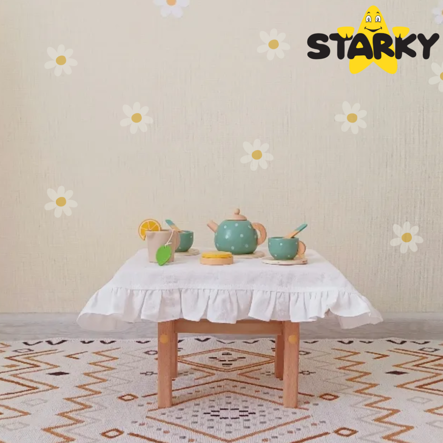 ☑️ Wykonany z drewna zestaw STARKY to nie tylko piękna zabawka, ale także prawdziwa uczta dla wyobraźni! ✨ Malowane detale i ozdobne wzory dodają uroku, a pastelowe kolory sprawiają, że serwis wygląda jak z bajki. To idealny sposób na wspólne spędzanie czasu i naukę dobrych manier przy stole. Co więcej – opakowanie jest tak piękne, że świetnie nadaje się na prezent! ?