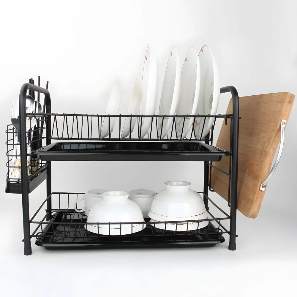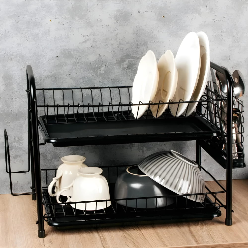 Innowacyjna dwupoziomowa budowa suszarki nie tylko zwiększa jej pojemność, ale także sprawia, że staje się ona niezastąpionym narzędziem w codziennym użytkowaniu kuchni. Dzięki przemyślanemu projektowi, suszarka oferuje miejsce na różnego rodzaju naczynia: talerze, miseczki, filiżanki, szklanki oraz sztućce, umożliwiając efektywne suszenie po każdym użyciu. Montaż dwóch tacek na ociekającą wodę przyspiesza suszenie i jest znacznie bardziej higieniczne!