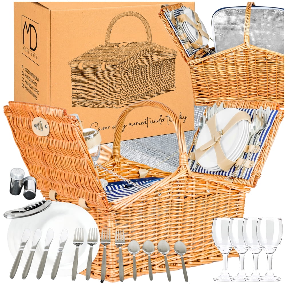 Duży wiklinowy kosz piknikowy z wbudowaną termotorbą i zastawą dla 4 osób - niebieski