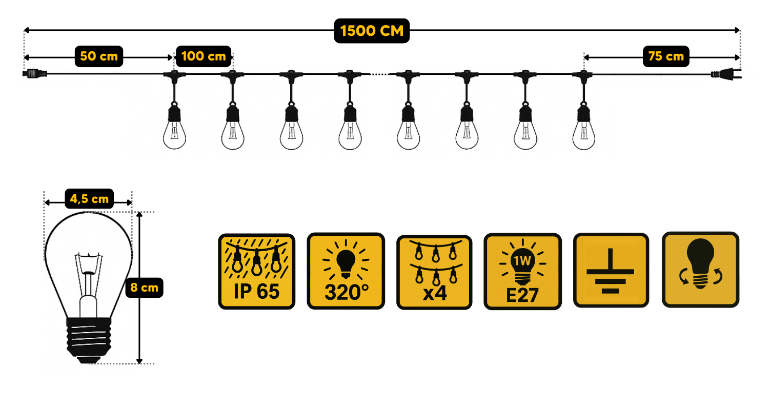 Girlandy posiadają wysoką klasę odporności IP65, oznacza to że idealnie nadają się do dekoracji zewnętrznej niezależnie od pogody i temperatury.