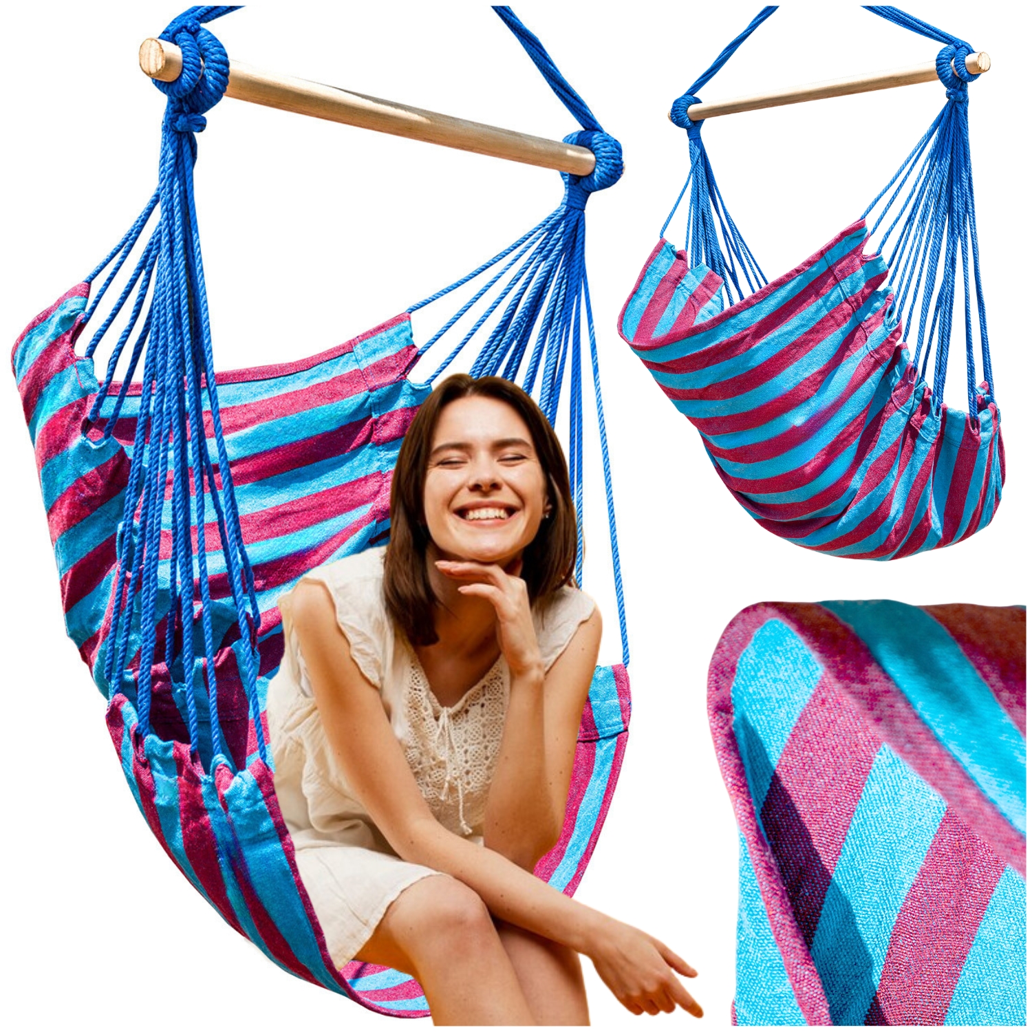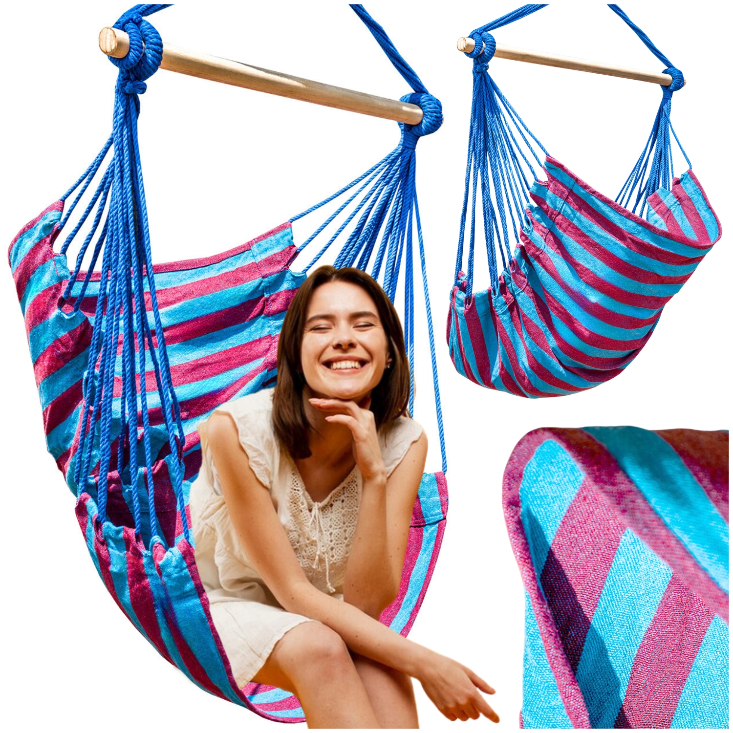 ▶️ Mocne sznurki mocujące są kolorystycznie dopasowane do wzoru hamaka, dzięki czemu całość wygląda pięknie i spójnie.