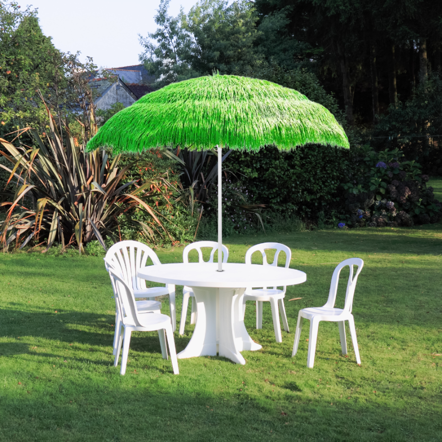 Zakochaj się w naszym parasolu ogrodowym w stylu hawajskim. Wprowadzi on nieco egzotyki do Twojej przestrzeni zewnętrznej, tworząc przytulną atmosferę i cień, idealnie na upalne dni.