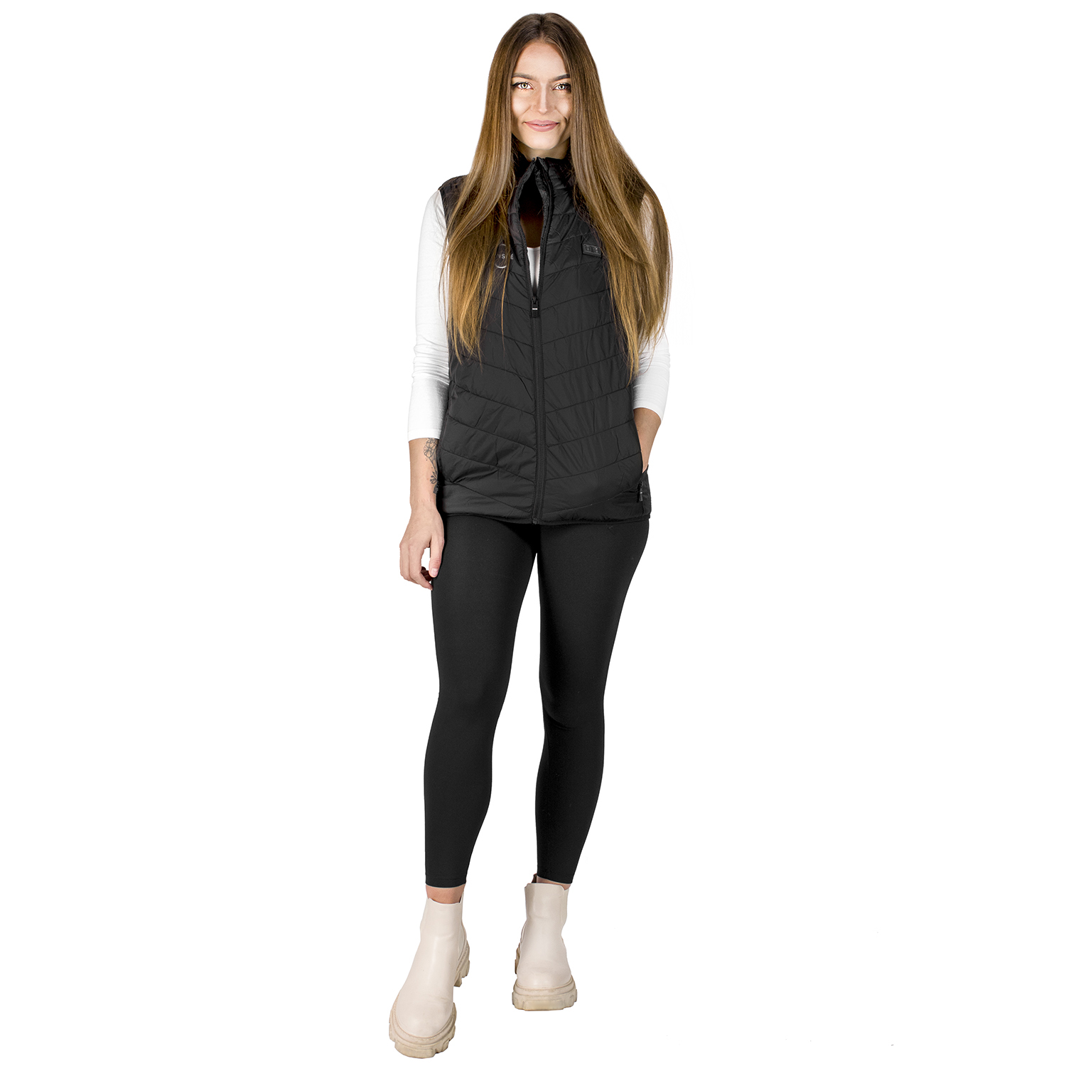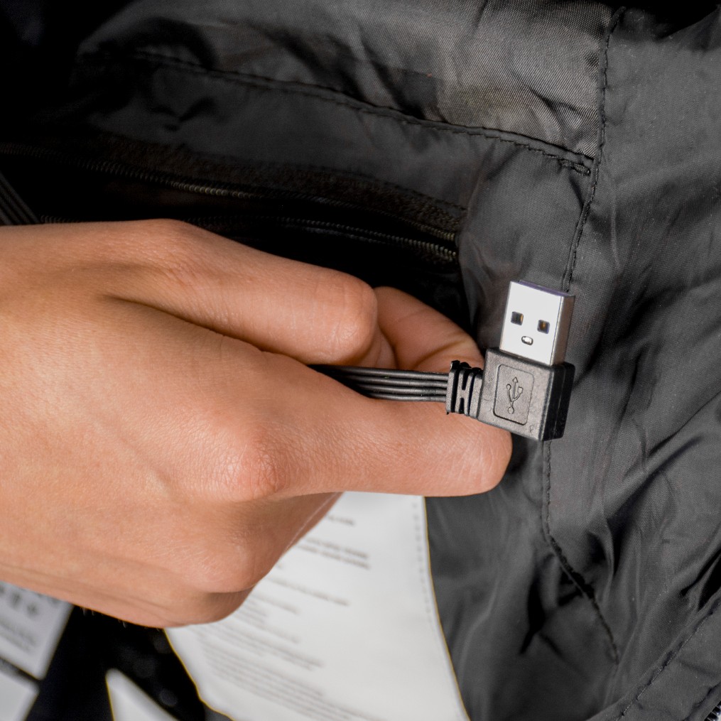 Wystarczy, że do kabla znajdującego się w kieszeni wewnętrznej kamizelki podłączysz powerbank, a następnie go włączysz. Naciśnij i przytrzymaj przełącznik regulacji temperatury na klatce piersiowej przez 3 sekundy i... gotowe! Ogrzewanie włączone!