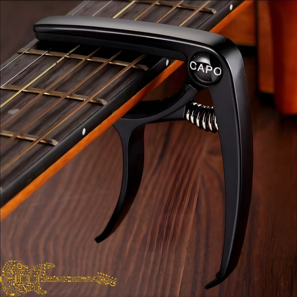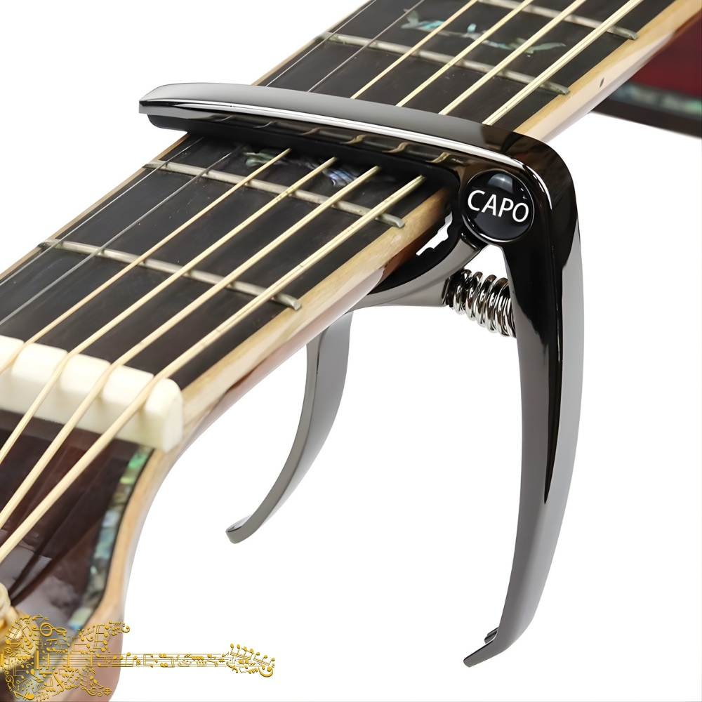 Jak założyć kapodaster? Wystarczy nacisnąć sprężynowy mechanizm i nałożyć kapodaster na wybrane miejsce na gryfie.