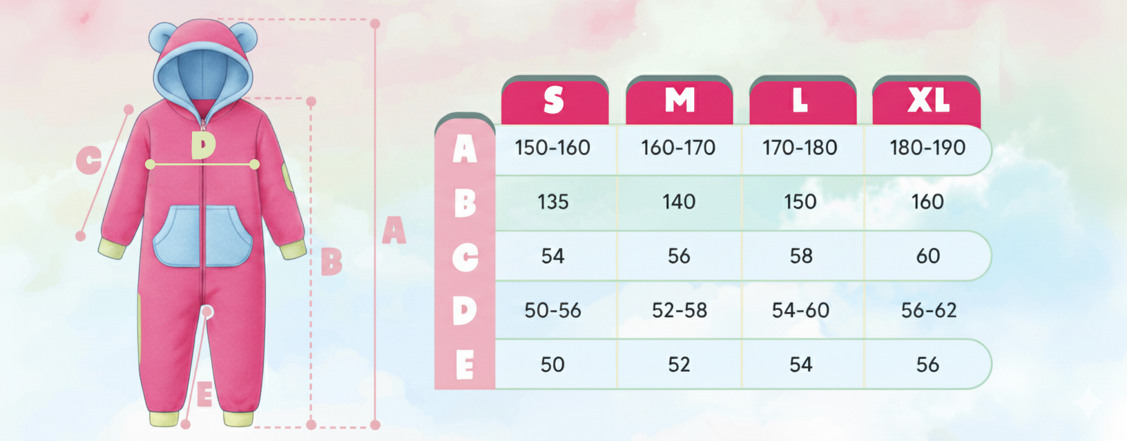 ❗️❗️Przy wyborze kigurumi najważniejszy jest wzrost – luźny fason sprawia, że pasuje na każdą sylwetkę. Dzięki temu wystarczy dopasować długość do wzrostu, by cieszyć się pełnym komfortem i swobodą ruchów. ✨