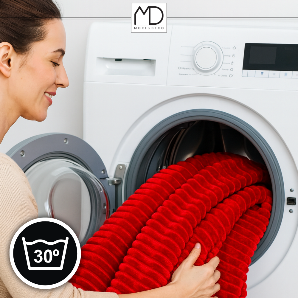 Koc można bezpiecznie prać w temperaturze 30°C, co pozwala na szybkie odświeżenie go bez ryzyka zniszczeń.