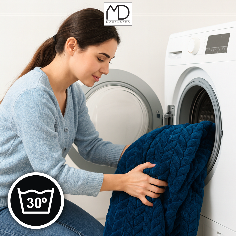 Koc można bezpiecznie prać w temperaturze 30°C, co pozwala na szybkie odświeżenie go bez ryzyka zniszczeń.