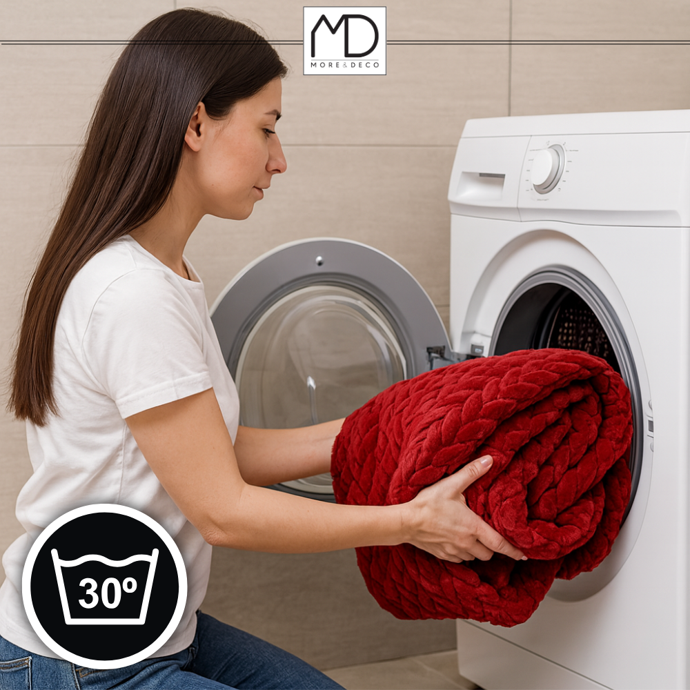 Koc można bezpiecznie prać w temperaturze 30°C, co pozwala na szybkie odświeżenie go bez ryzyka zniszczeń.