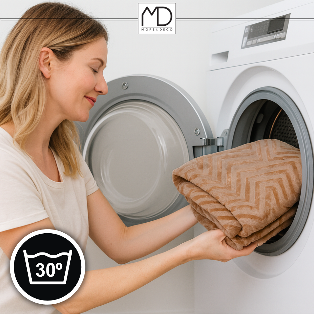 Koc można bezpiecznie prać w temperaturze 30°C, co pozwala na szybkie odświeżenie go bez ryzyka zniszczeń.