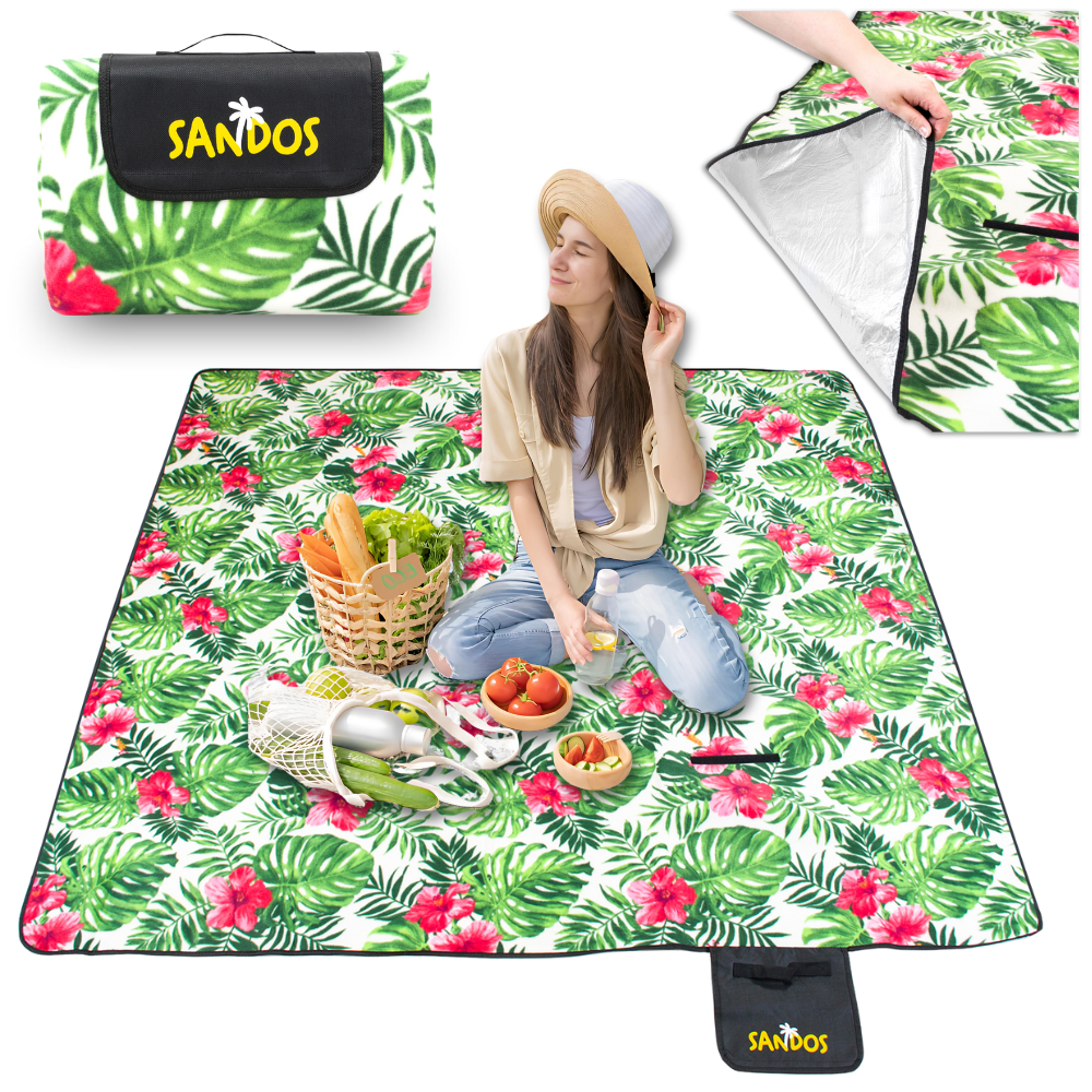 ⭐ DUŻY KOC PIKNIKOWY SANDOS 200 X 200 CM WODOODPORNY Z WARSTWĄ ALUMINIOWĄ ⭐