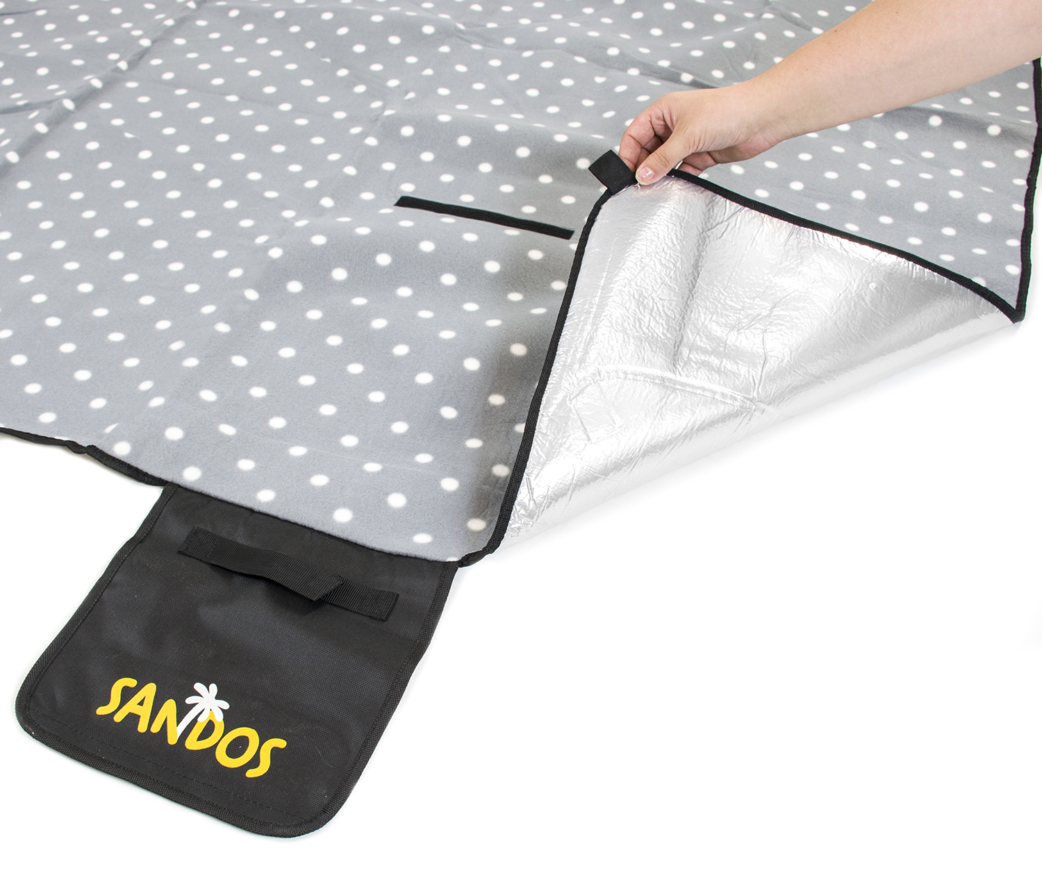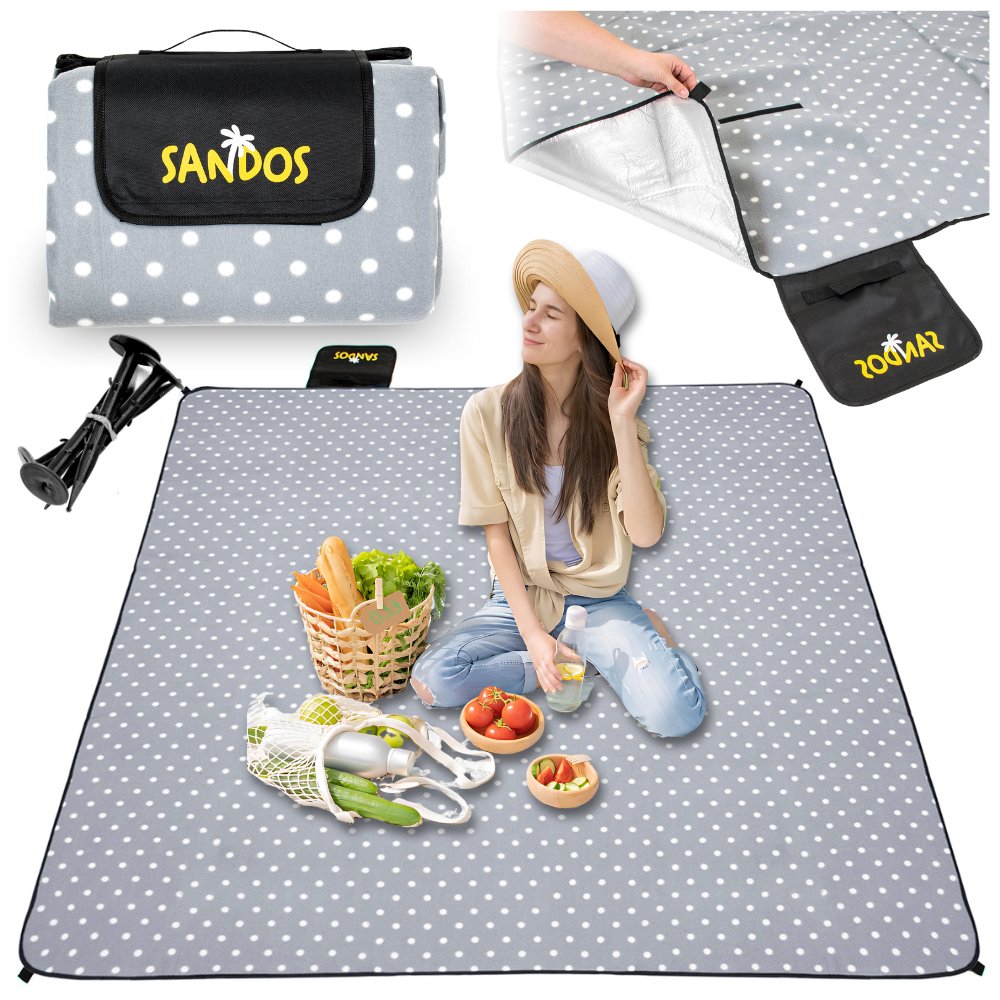 ⭐ DUŻY KOC PIKNIKOWY SANDOS 200 X 200 CM WODOODPORNY Z WARSTWĄ ALUMINIOWĄ + KOTWY⭐