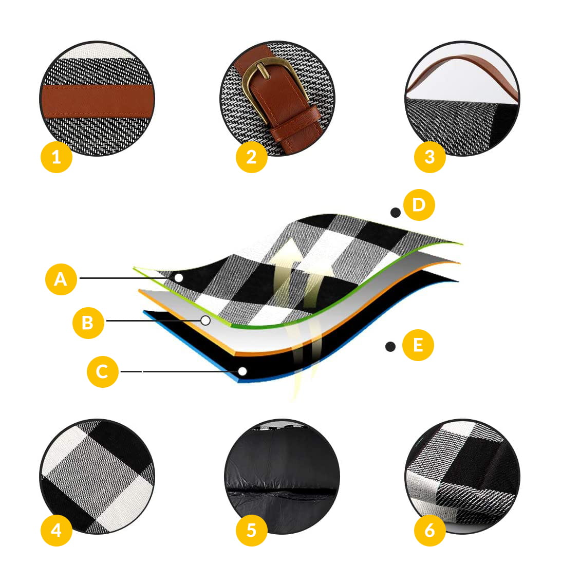 - D, E: Zarówno górna jak i dolna warstwa koca jest wodoodporna i możesz go przemyć mokrą szmatką.
