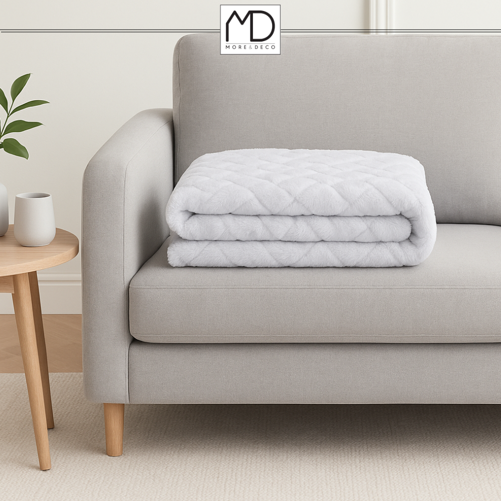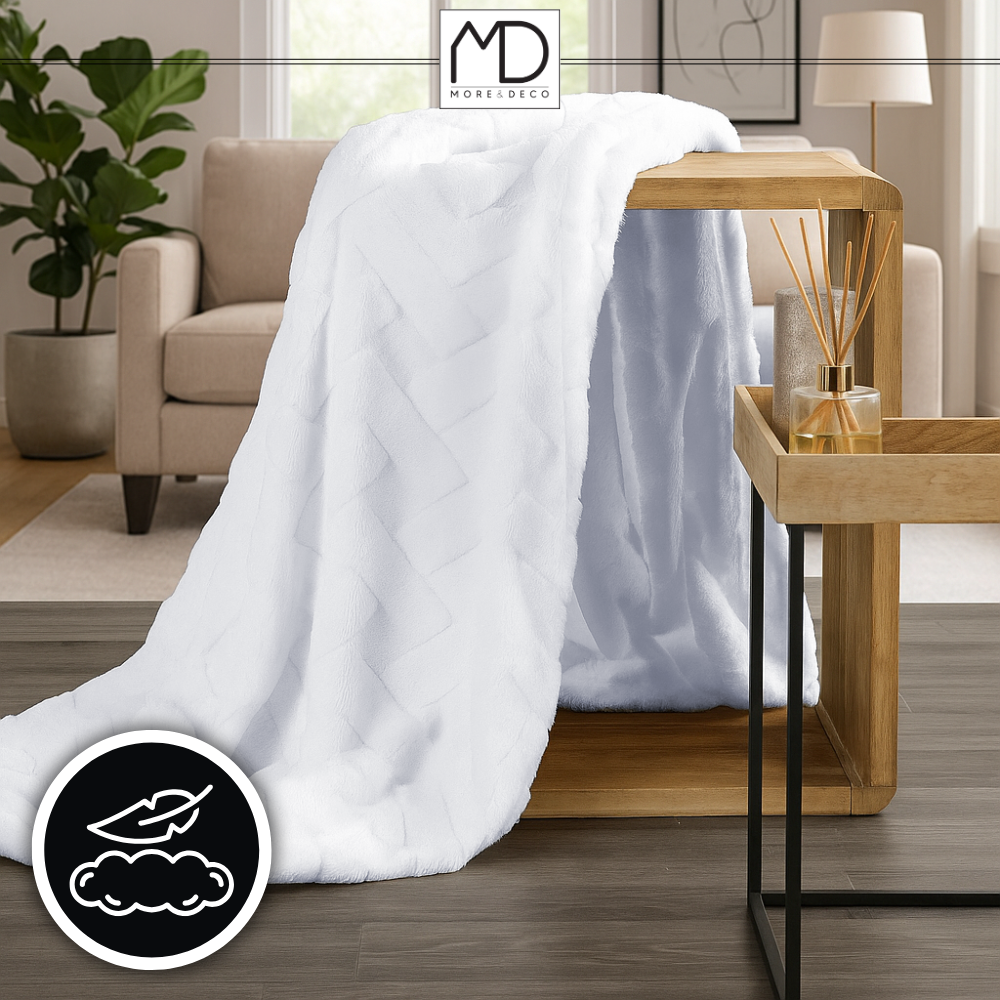 Biel jest uniwersalna i ponadczasowa – pasuje do każdego wystroju, nadając wnętrzu wyrazistości i klasy. Idealnie prezentuje się jako narzuta na łóżko lub dekoracja kanapy.