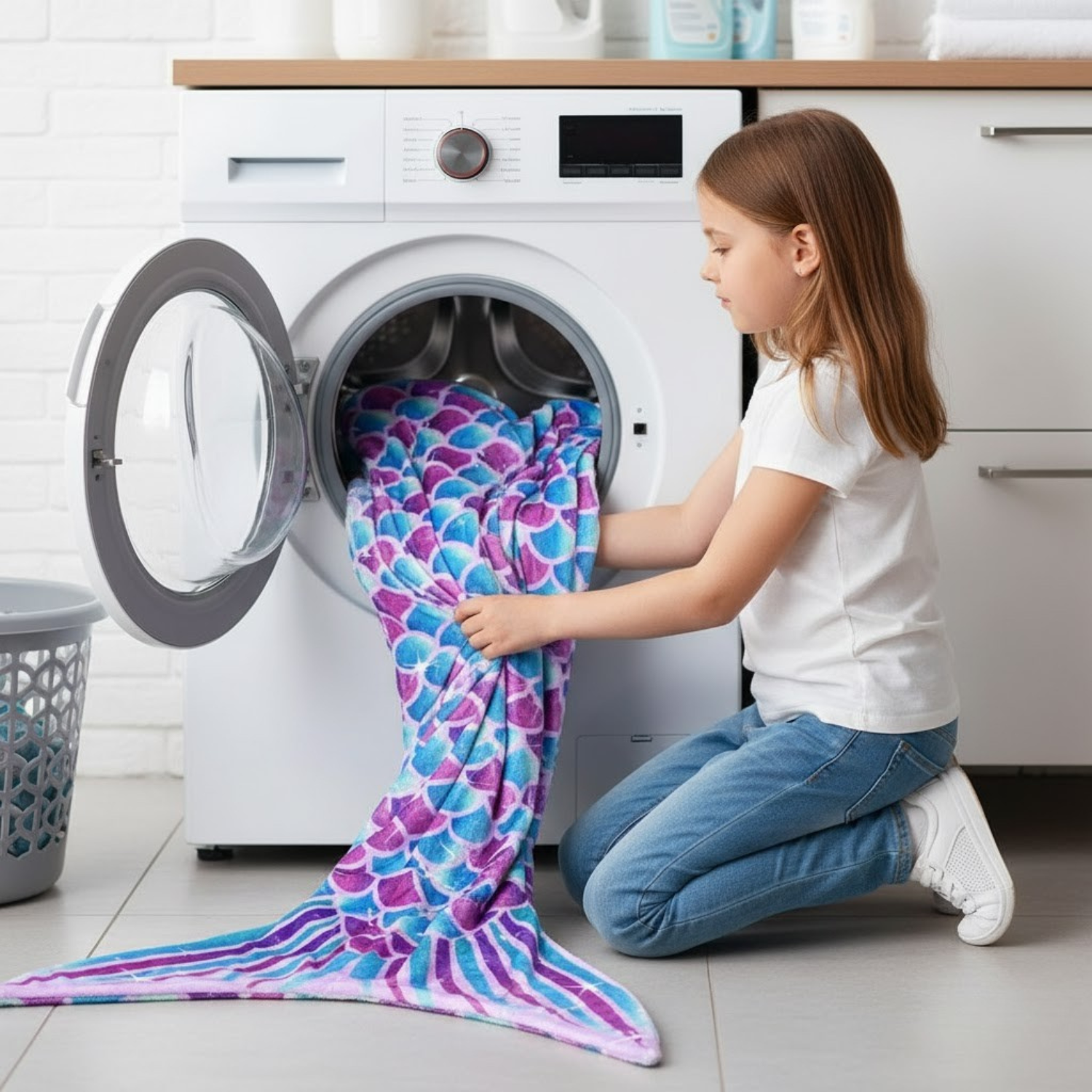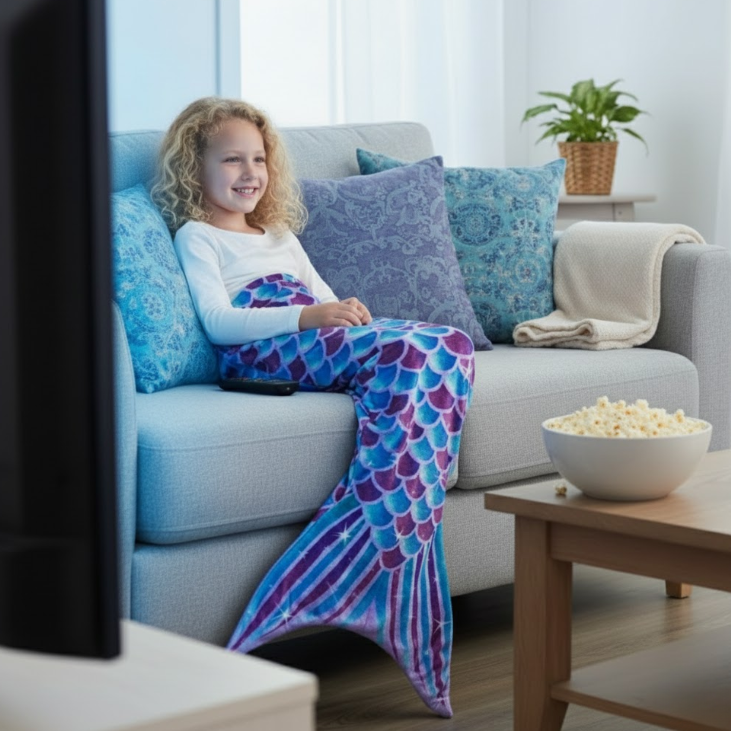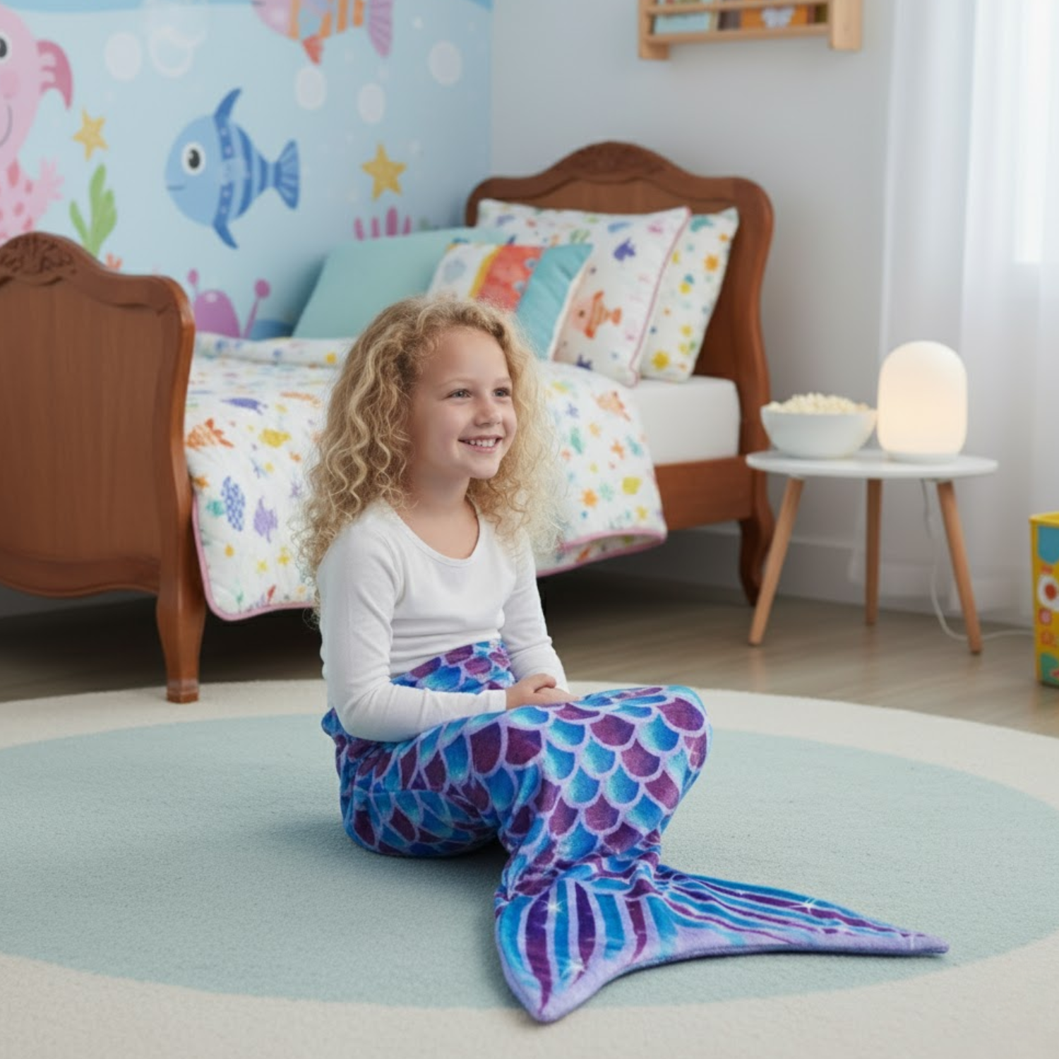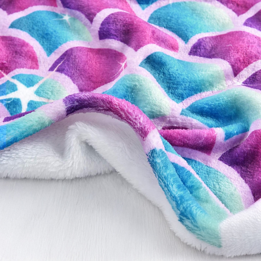 Ten kocyk to nie tylko funkcjonalność, ale także piękny, bajkowy wygląd. Motyw łusek syreny w odcieniach fioletu i niebieskiego sprawia, że każda dziewczynka poczuje się jak prawdziwa mała syrenka! Doskonale prezentuje się na zdjęciach i dodaje uroku każdemu wnętrzu – świetnie wygląda na kanapie, w łóżku czy fotelu.