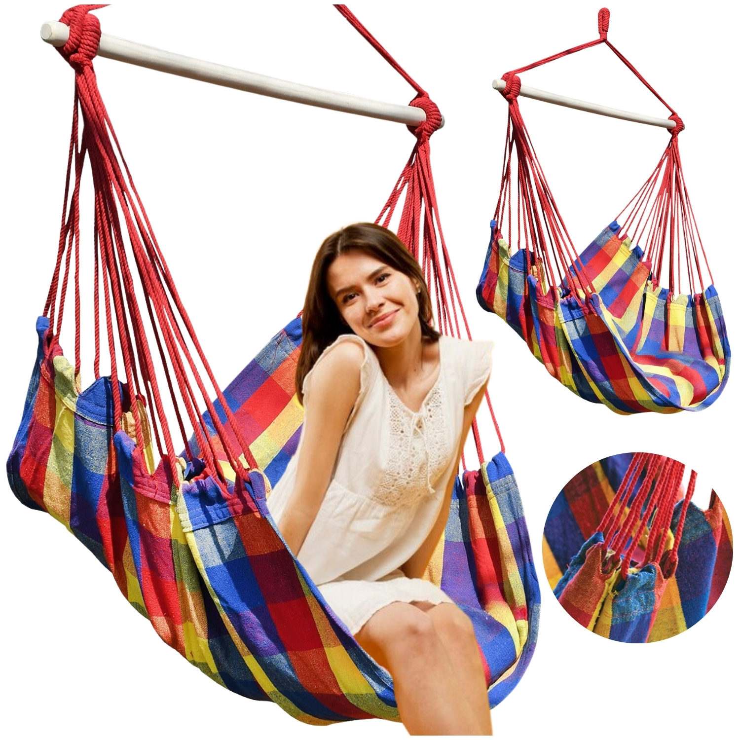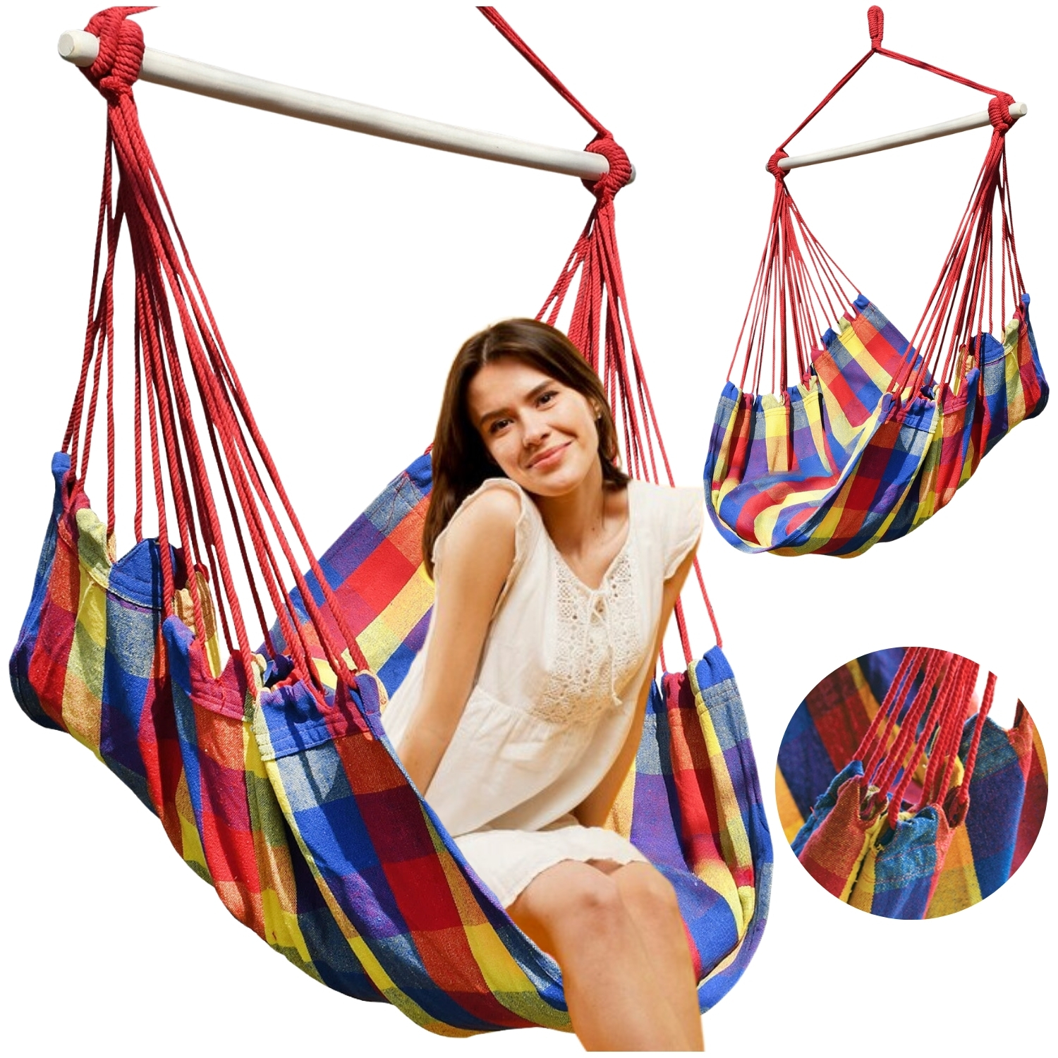▶️ Mocne sznurki mocujące są kolorystycznie dopasowane do wzoru hamaka, dzięki czemu całość wygląda pięknie i spójnie.