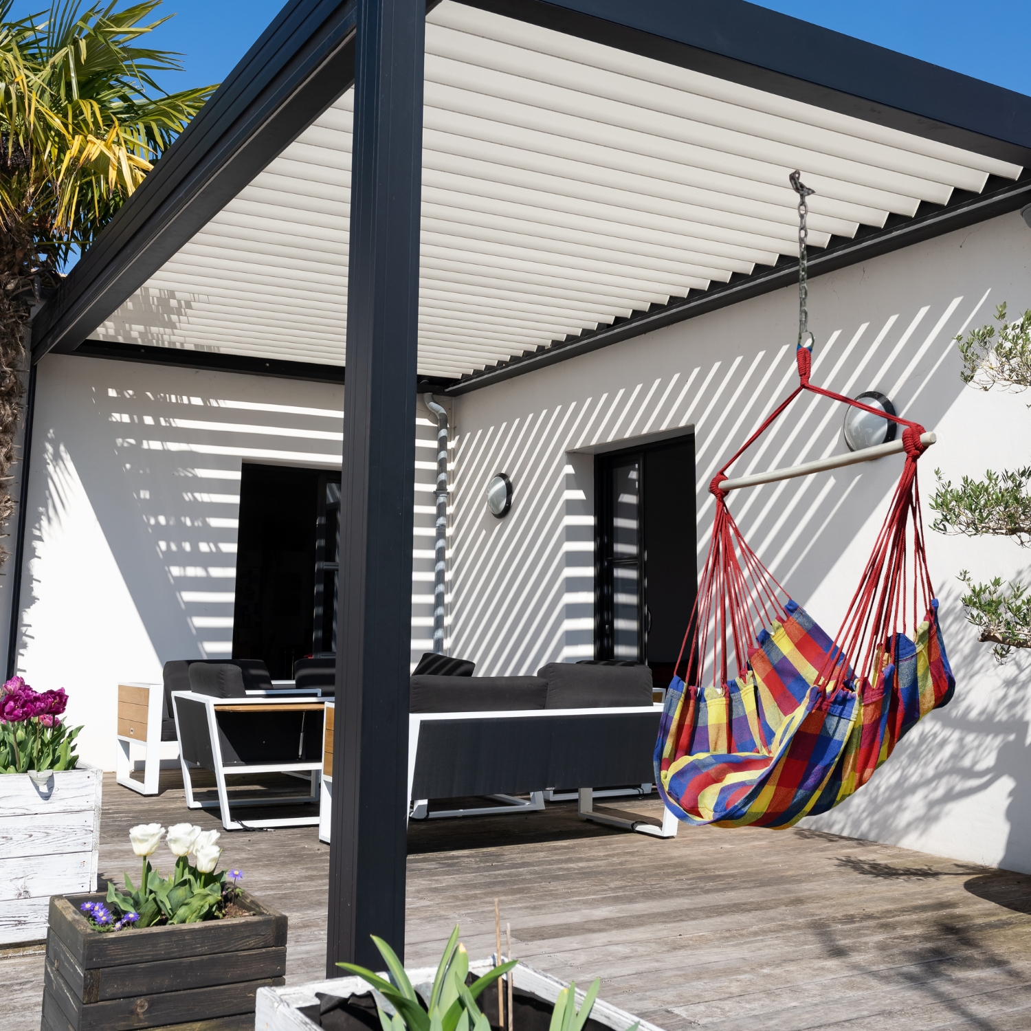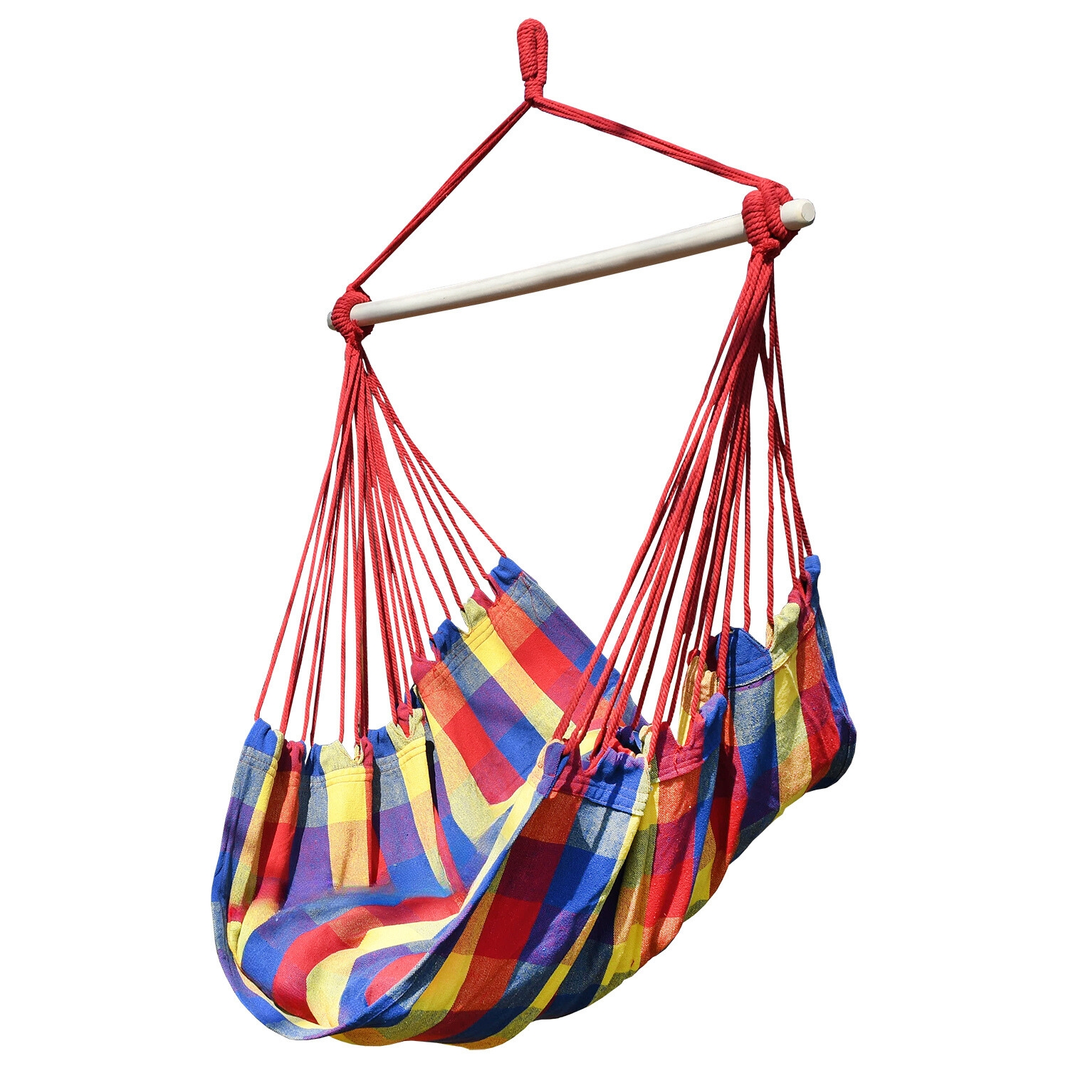 Poprzeczka z drewna zapewnia równomierne rozłożenie materiału, co sprawia, że hamak rozkłada się jak krzesło - możesz się w nim swobodnie opalać, czytać lub po prostu wypoczywać!