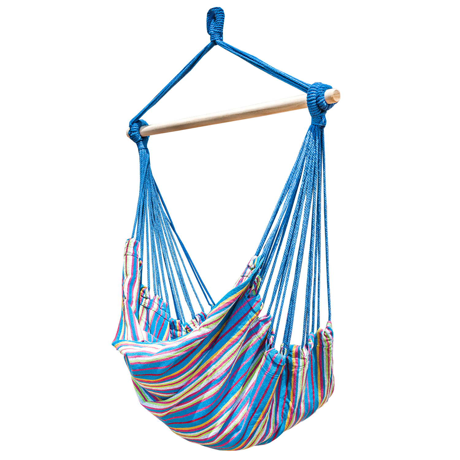 Poprzeczka z drewna zapewnia równomierne rozłożenie materiału, co sprawia, że hamak rozkłada się jak krzesło - możesz się w nim swobodnie opalać, czytać lub po prostu wypoczywać!