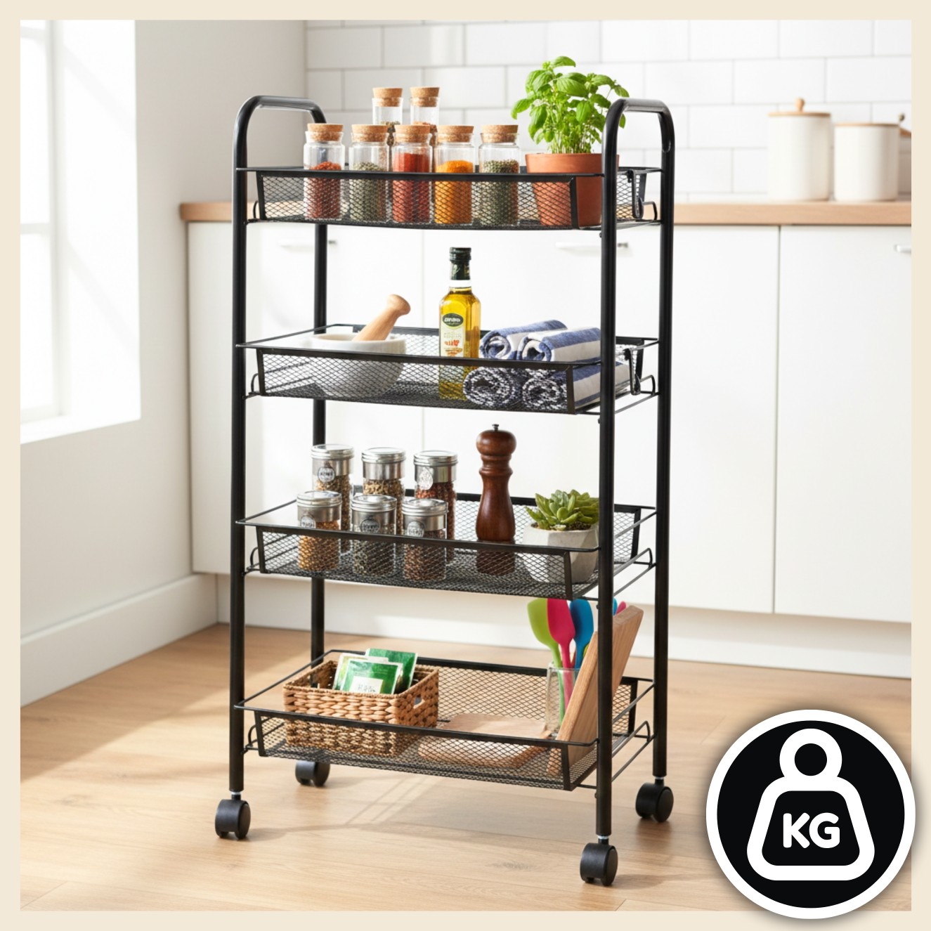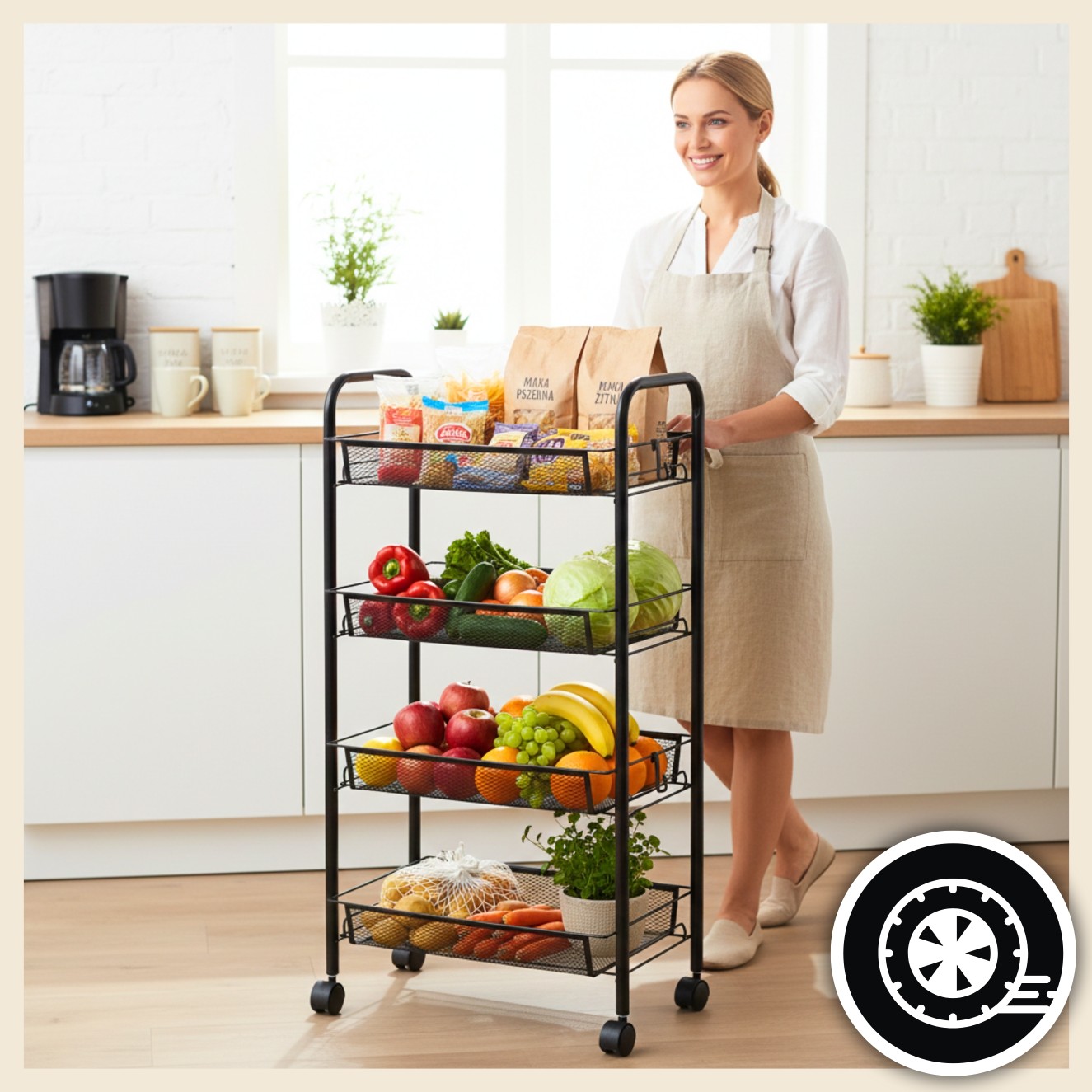 ⭐ Dzięki kółkom możesz przesuwać regał pomiędzy blatem, lodówką, zlewem – tam, gdzie akurat jest potrzebny!