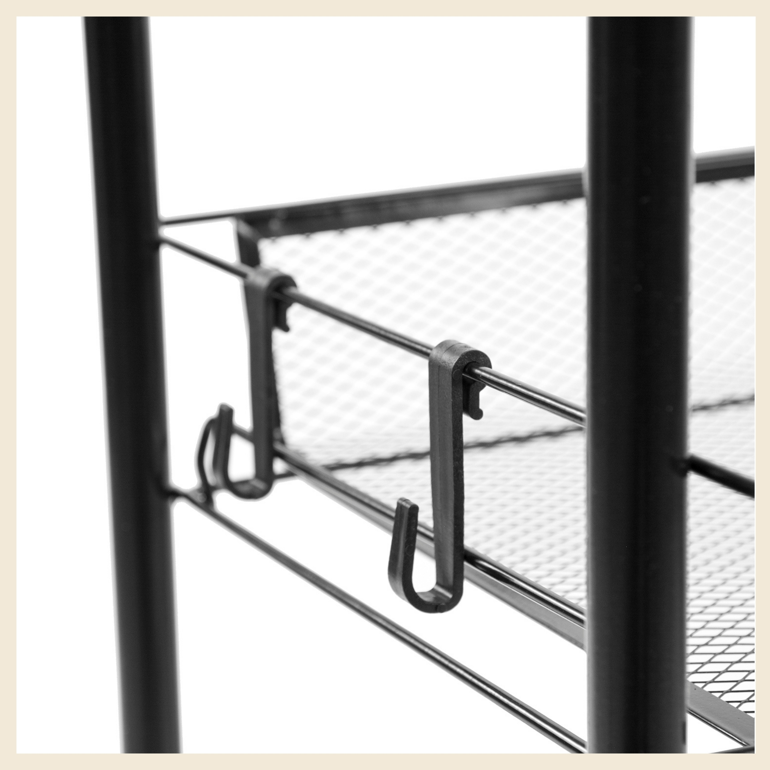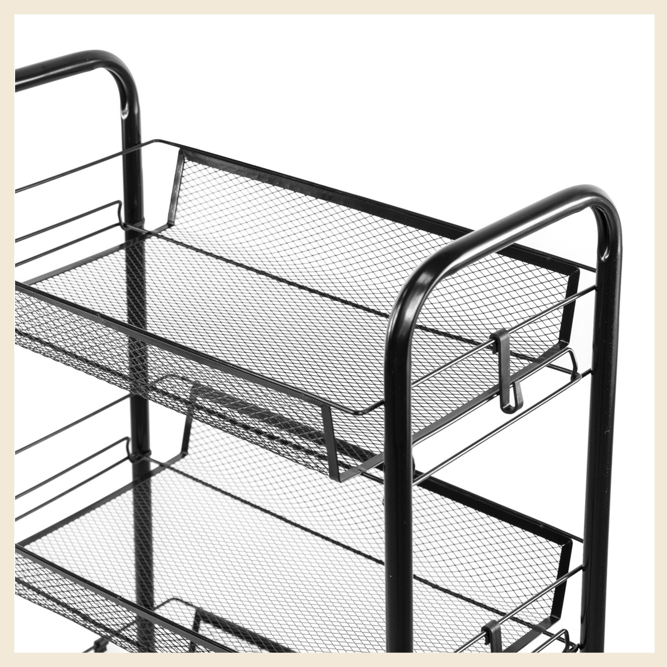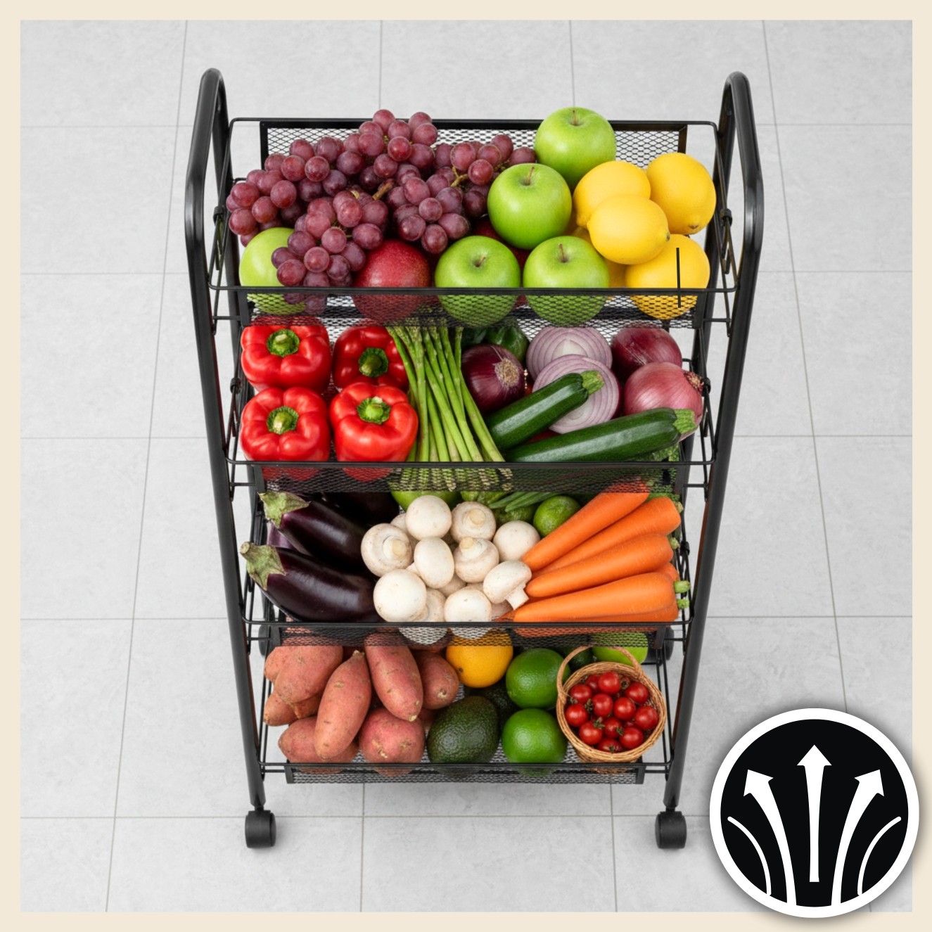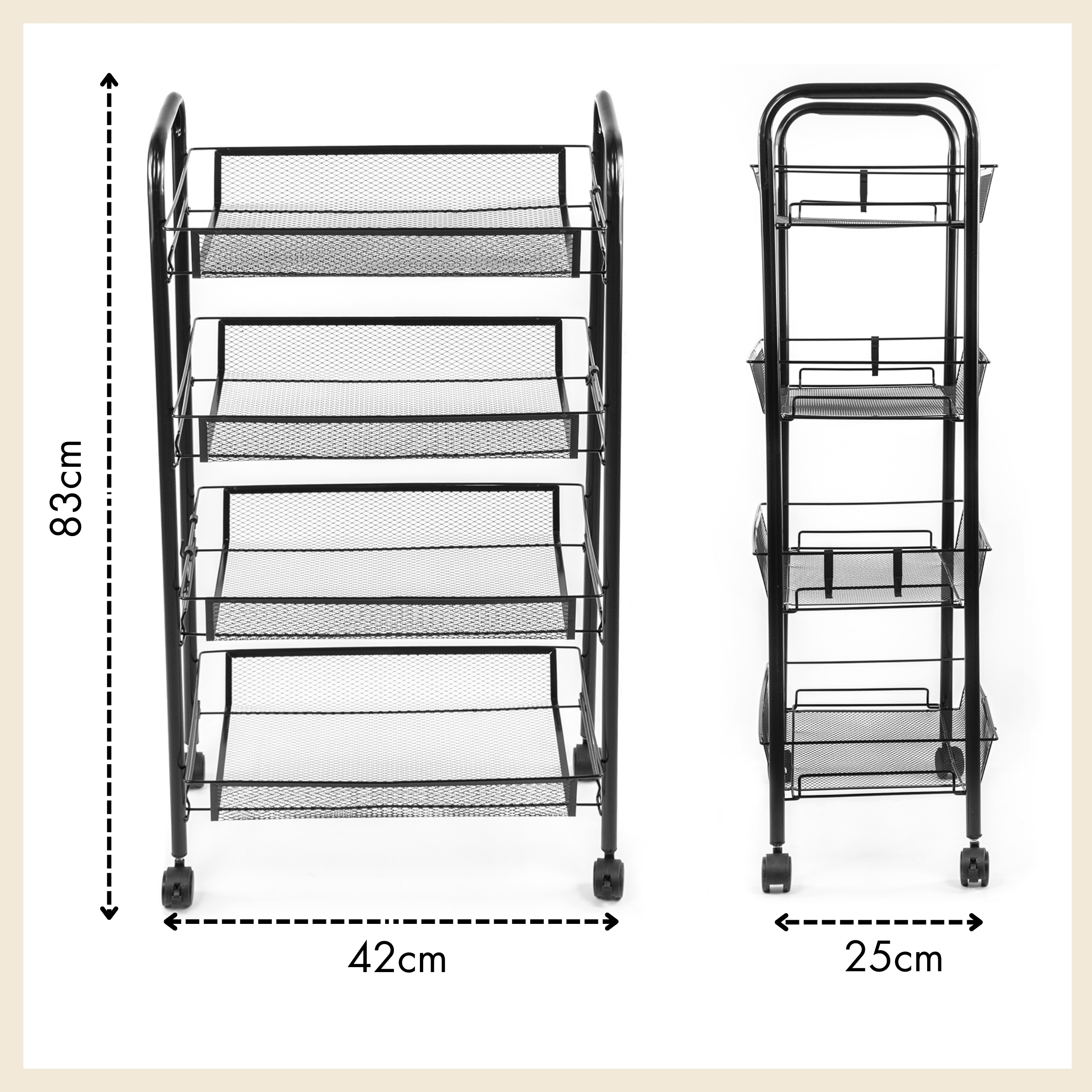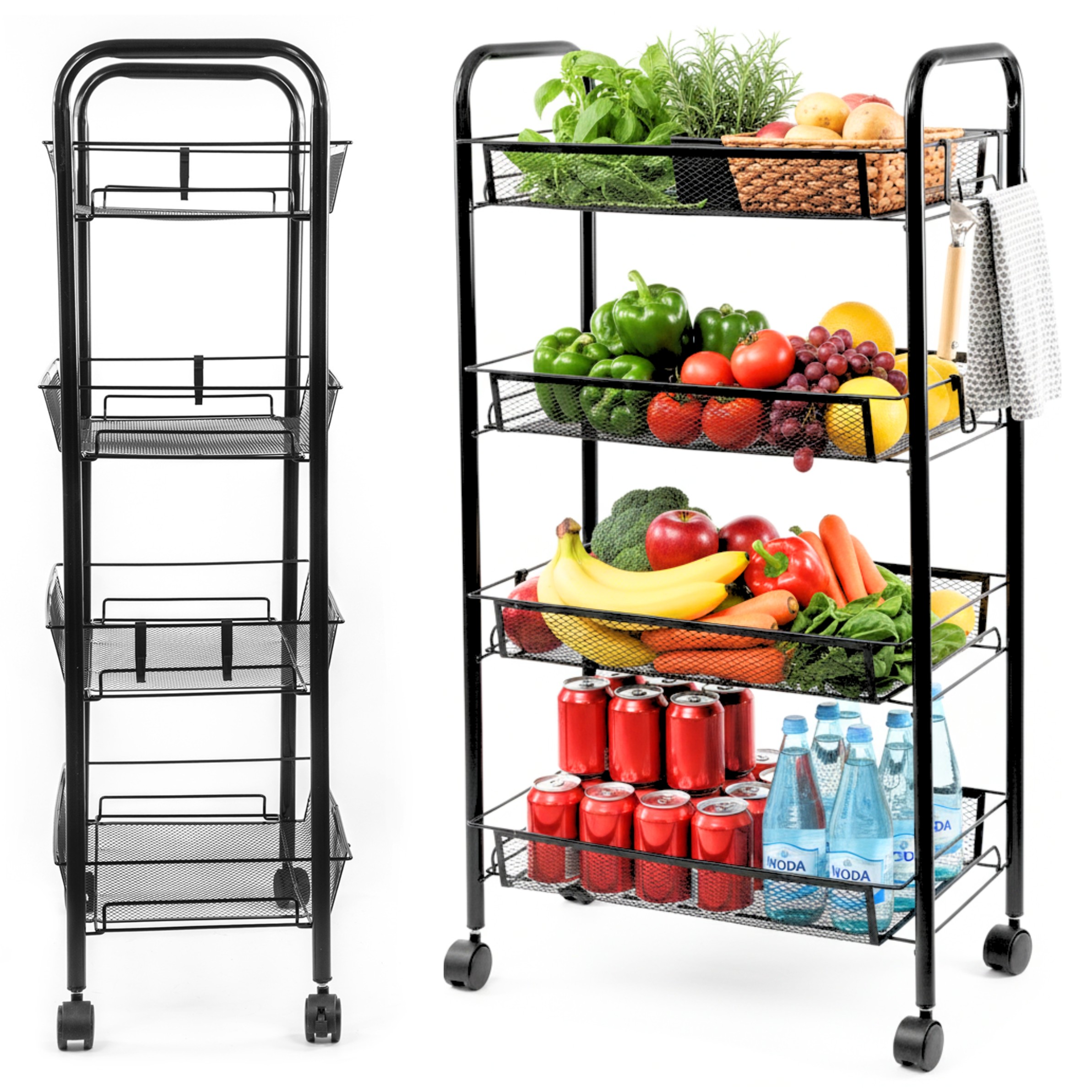 Wytrzymały stelaż z czarnej stali i cztery pojemne kosze umożliwiają przechowywanie zarówno żywności, jak i akcesoriów. Każda półka udźwignie do 7 kg, więc bez obaw zmieścisz w nim także cięższe produkty i przybory. Perforowane ścianki wspierają cyrkulację powietrza, co jest szczególnie przydatne przy świeżych owocach i warzywa.Na półkach przechowasz m.in.: