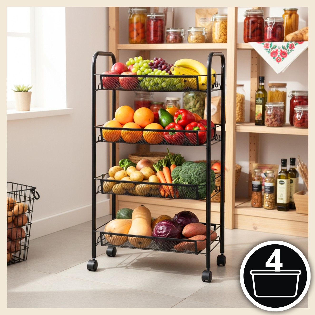Kuchenny regał mobilny na kółkach - 4 półki na warzywa i owoce