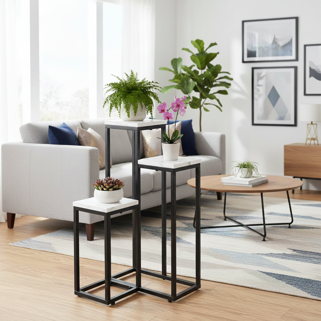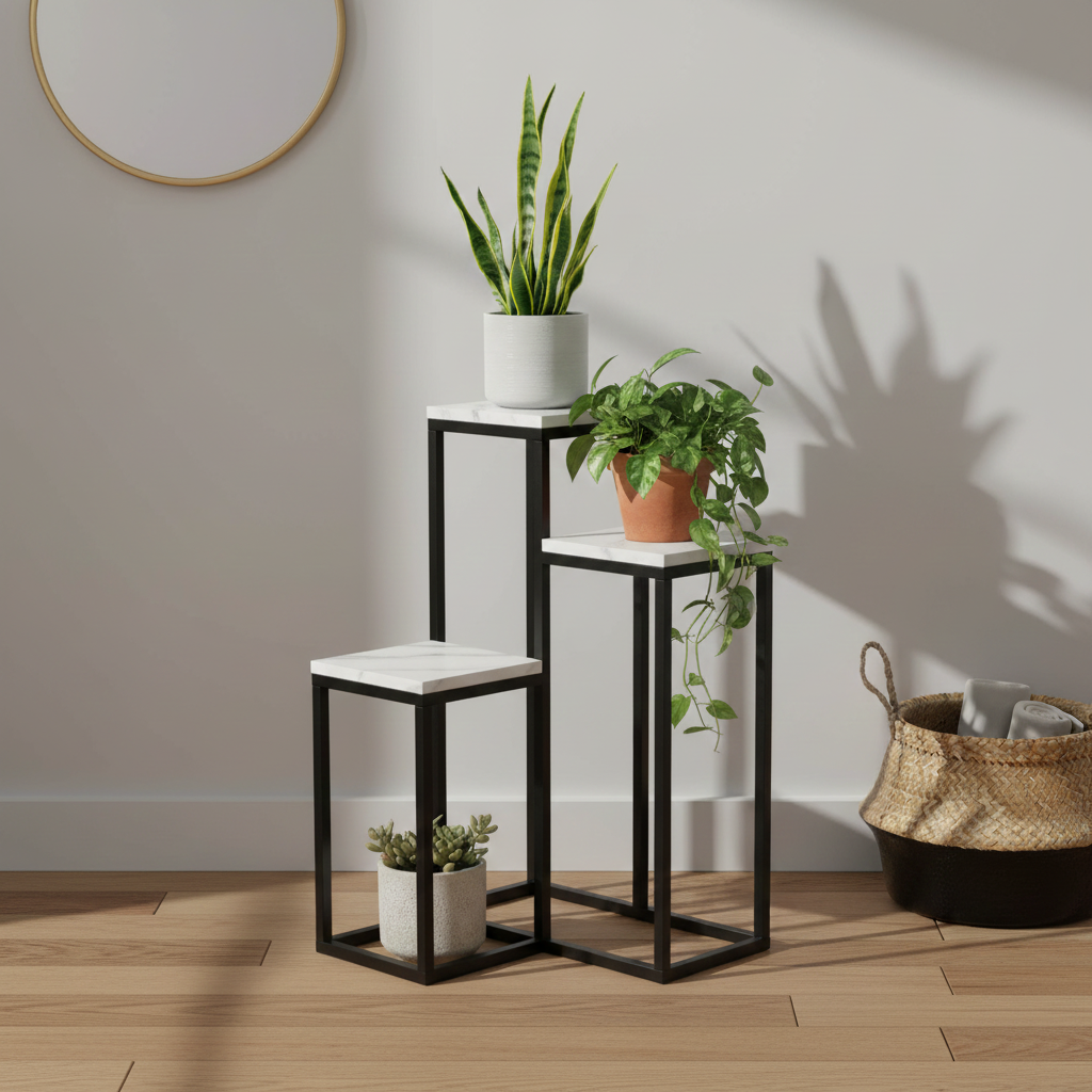 ✨ Dzięki metalowej konstrukcji i półkom z płyty meblowej, kwietnik jest stabilny, trwały i pasuje do nowoczesnych aranżacji.