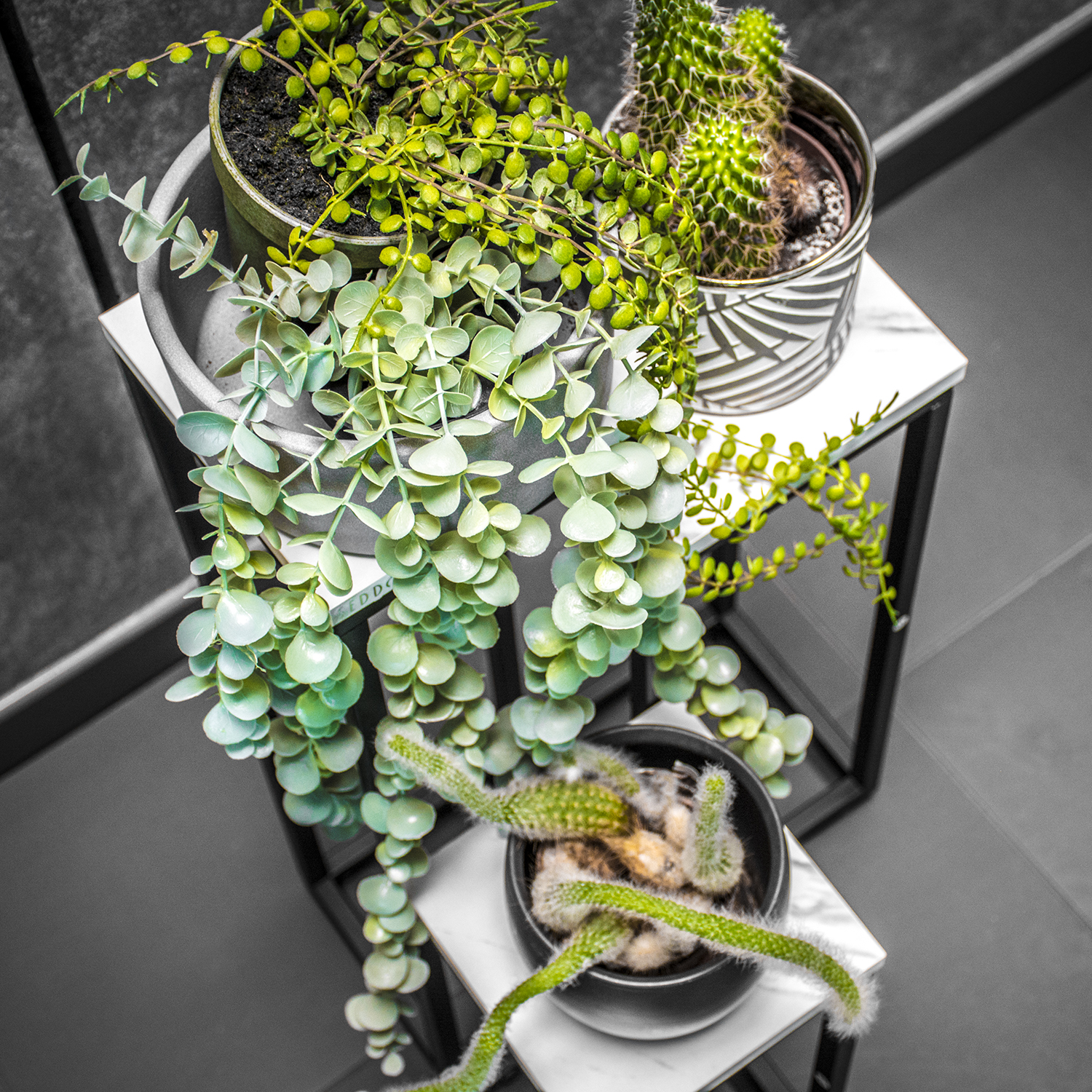Możesz umieścić na nim zarówno sukulenty, paprocie, jak i większe rośliny o zwisających liściach. Sprawdzi się także jako regał na doniczki z ziołami w kuchni.