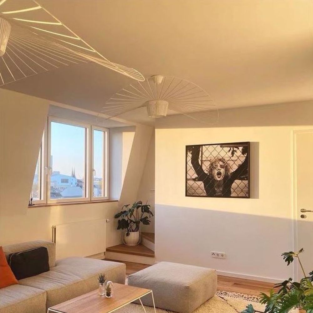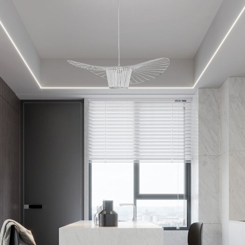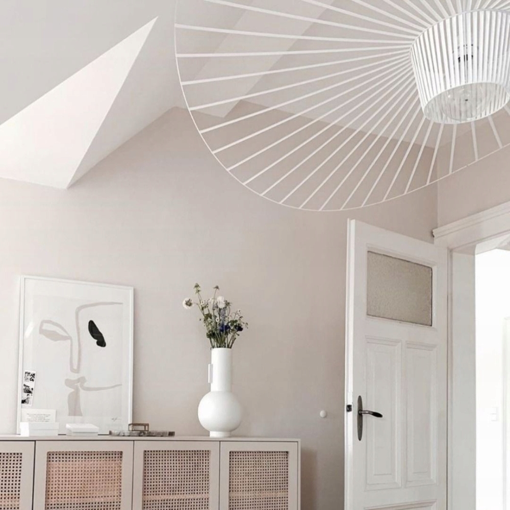 - elegancki żyrandol składający się z białego korpusu wykonanego z metalu i włókna szklanego, taśm z elastycznego materiału oraz linki do zawieszenia, której wysokość możesz wygodnie regulować.