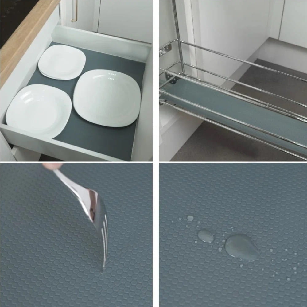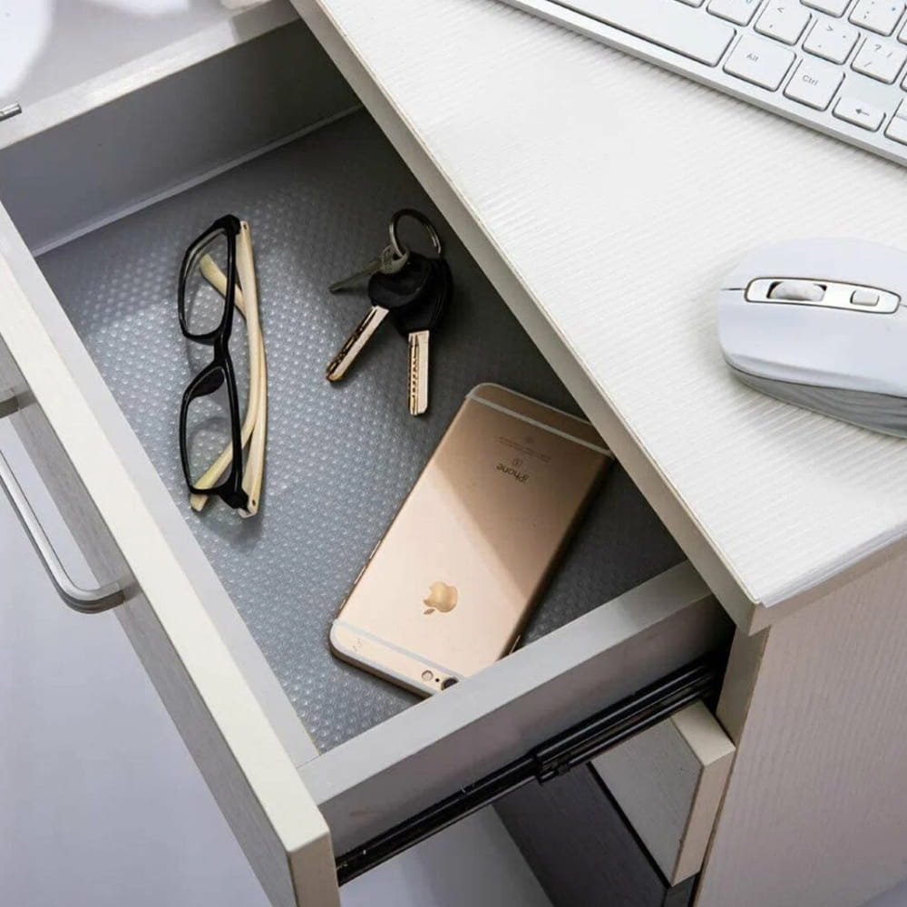 Dzięki specjalnej antypoślizgowej strukturze mata zapobiega przesuwaniu się przedmiotów, co sprawia, że talerze, szklanki czy kosmetyki pozostają na swoim miejscu. To idealne rozwiązanie do szuflad, szafek, lodówki czy nawet półek na buty!
