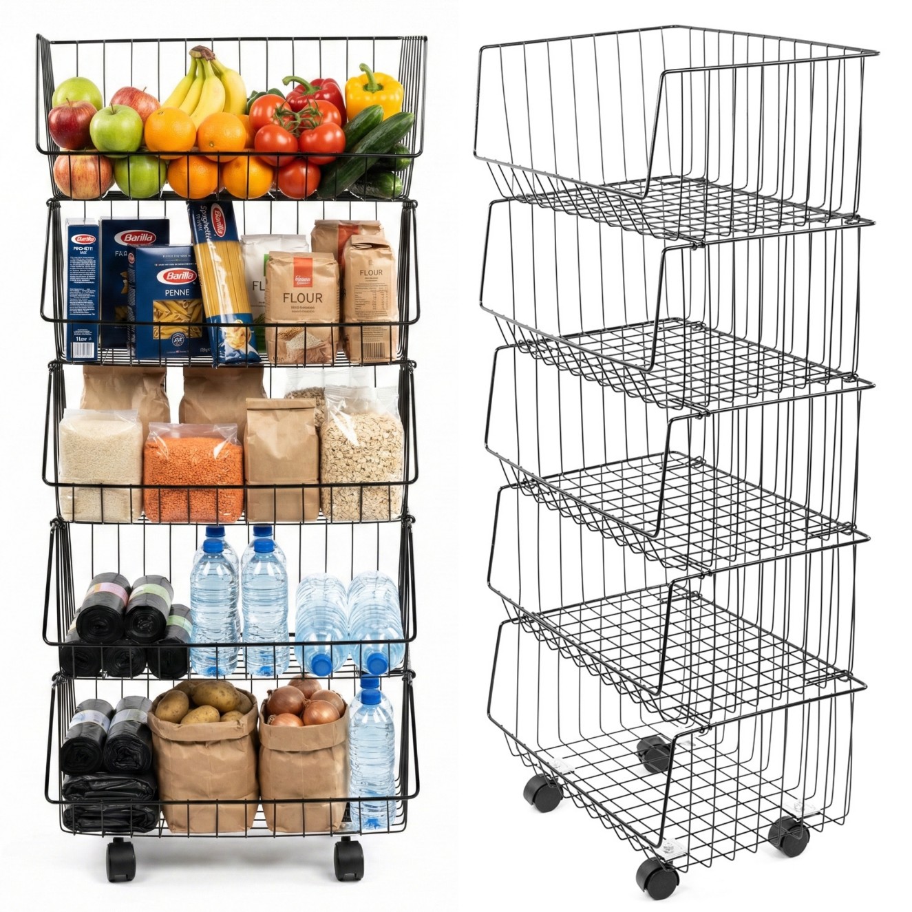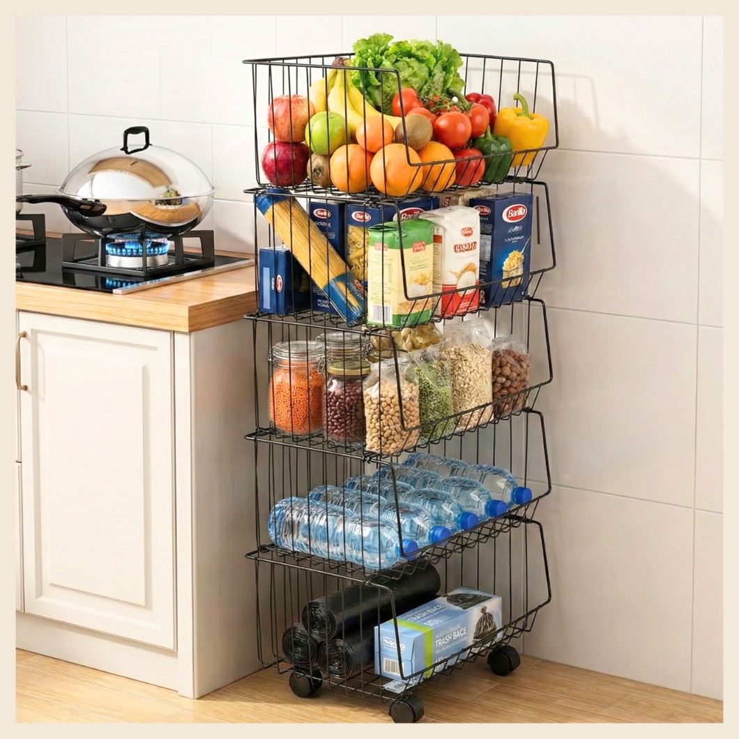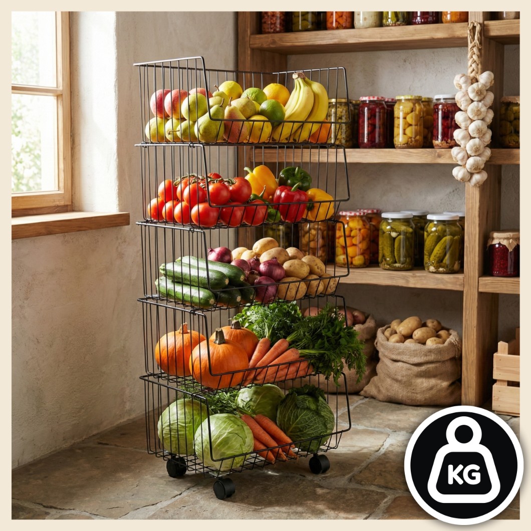 Konstrukcja opiera się na solidnej, metalowej ramie oraz pięciu wysuwanych koszach. Każda półka udźwignie do 7 kg, zachowując pełną stabilność. Ażurowe ścianki wspomagają przepływ powietrza, dlatego regał doskonale nadaje się do świeżej żywności. Wszystko, czego potrzebujesz, masz zawsze pod ręką:
