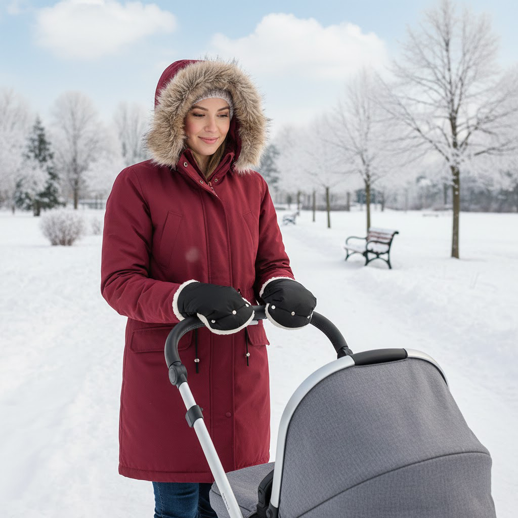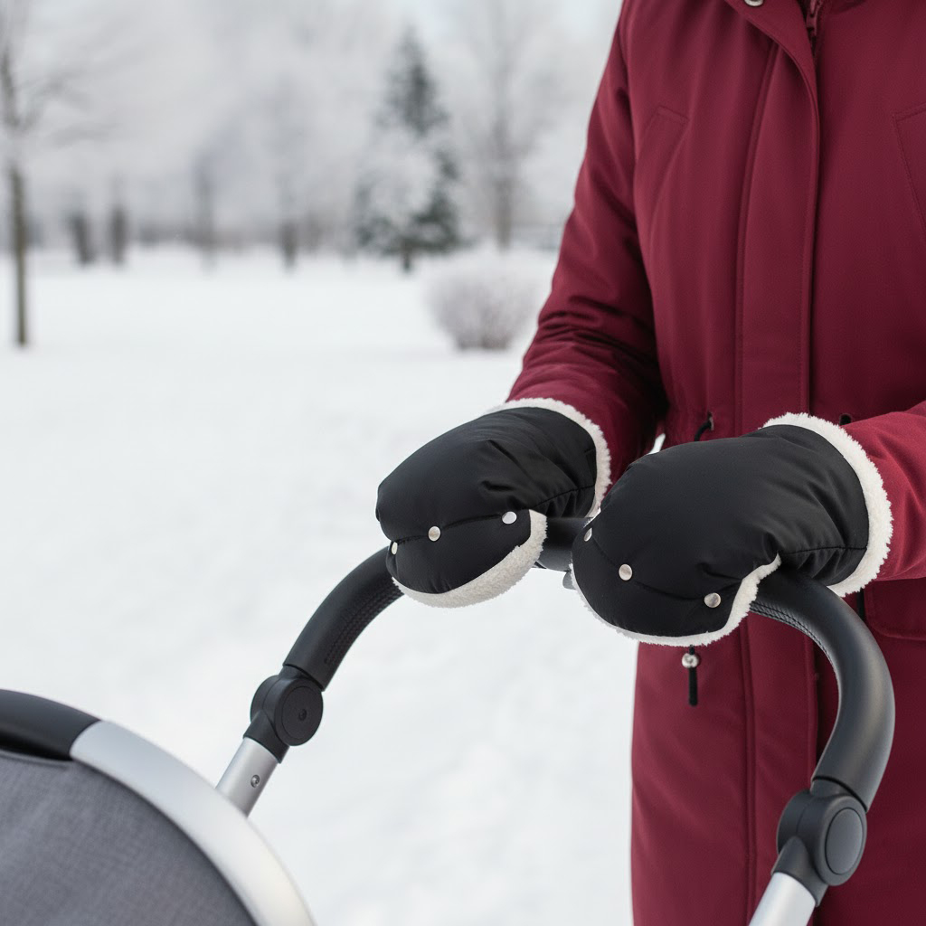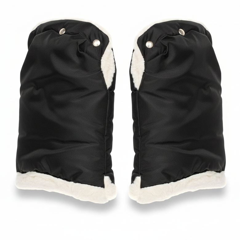 Mufki wygodnie przypniesz do rączki wózka lub sanek za pomocą zatrzasków (nap). Dzięki temu zawsze będą na miejscu, aby otulić Twoje dłonie podczas spaceru w zimowej aurze.