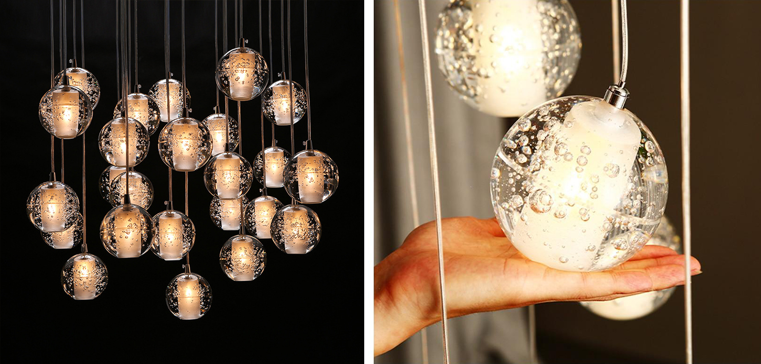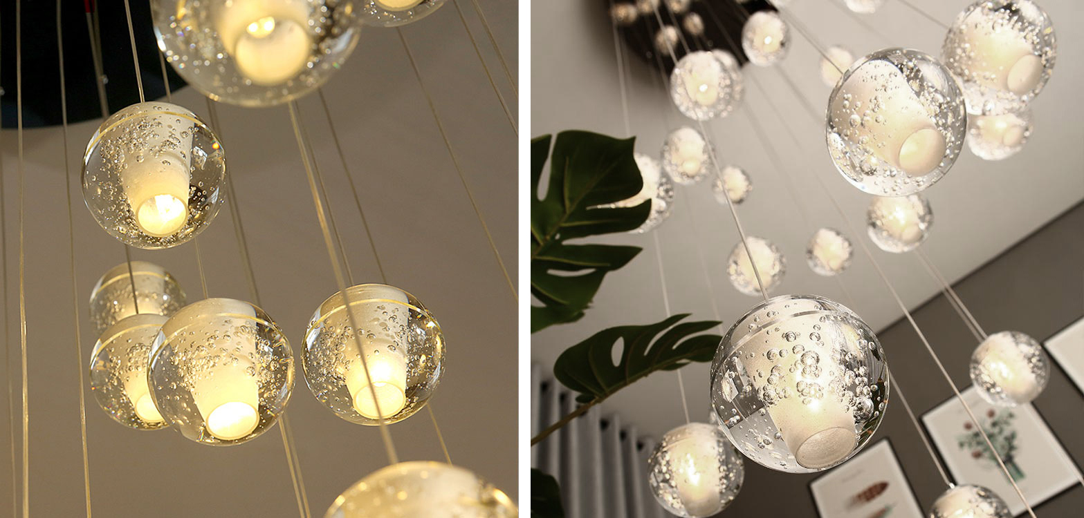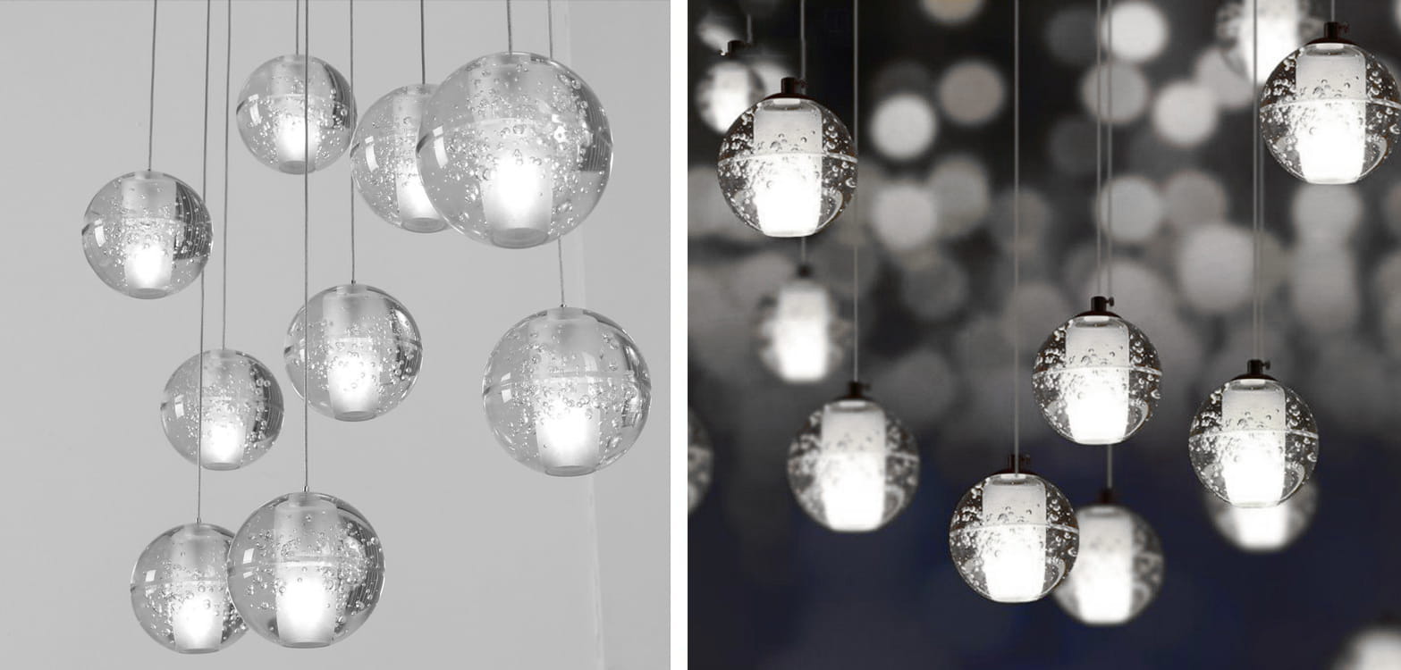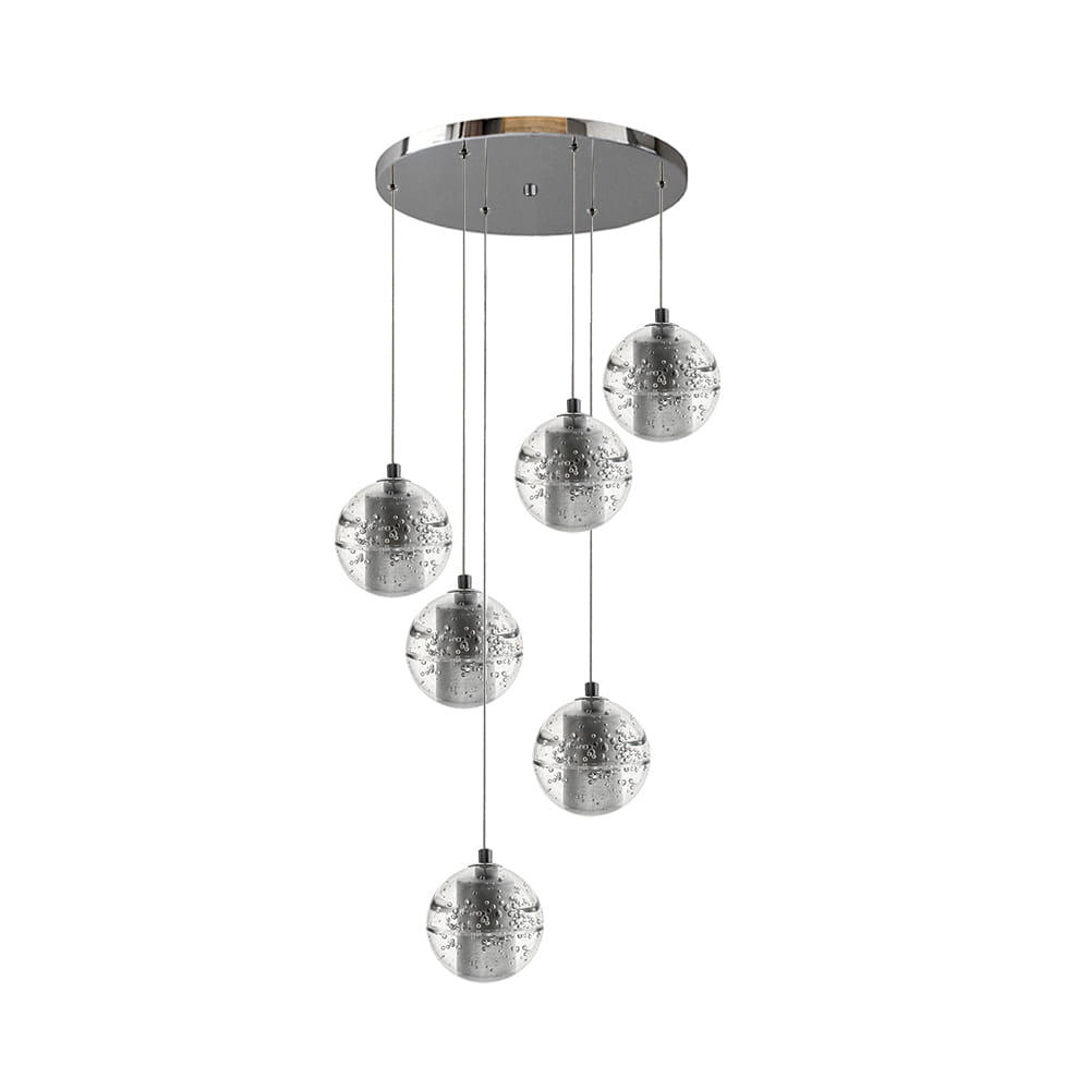 Lampa nada się do każdego minimalistycznego pomieszczenia. Szczególnie dobrze sprawdzi się w kuchniach i sypialniach. Składa się z sześciu przezroczystych kul, zawieszonych do chromowanego elementu przy suficie.