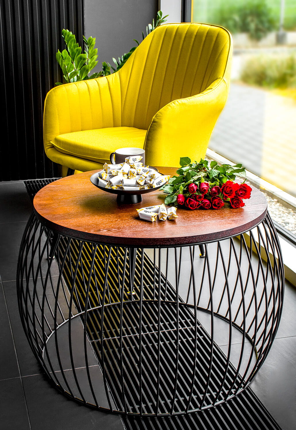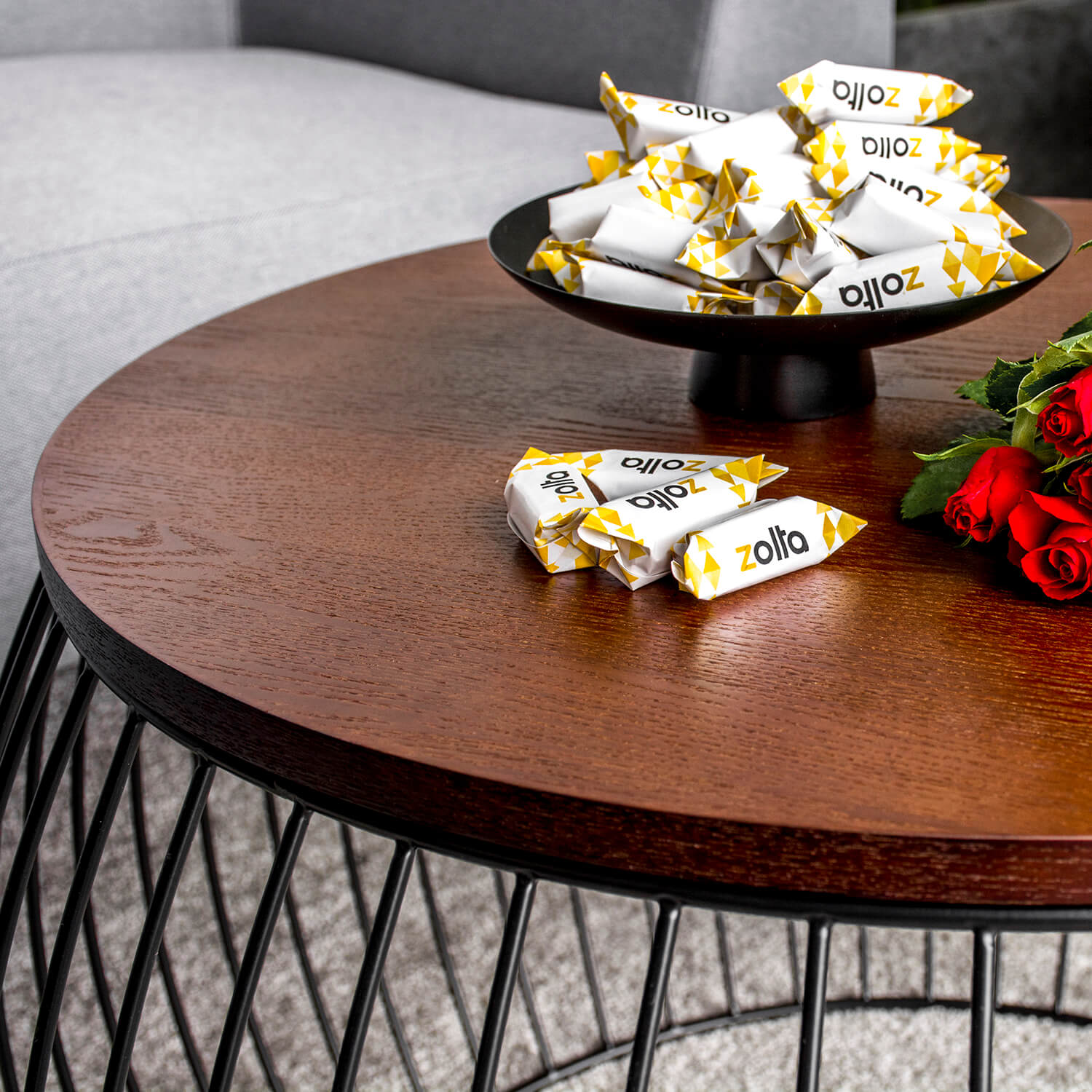 Stolik posiada solidną metalową rame malowaną proszkowo, inspirowaną kształtem bębna.