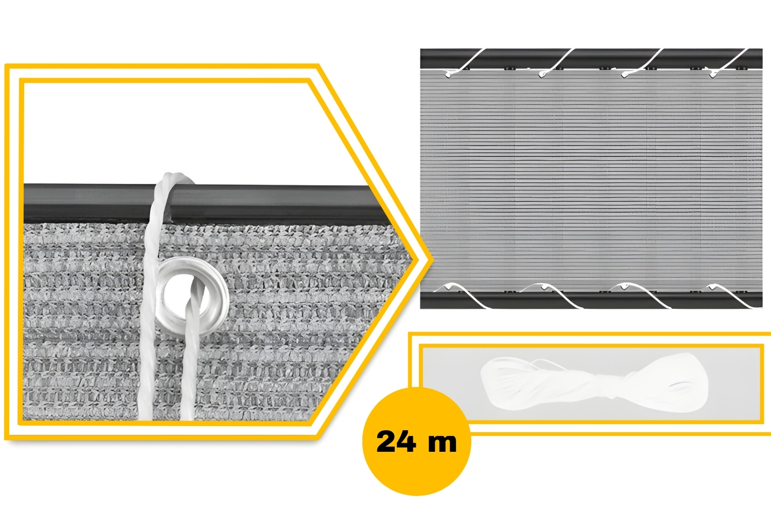 ⭕️ Aluminiowe oczka o zwiększonej odporności na rdzę, które zostały wszyte co 50 cm, zapewniają szybki i stabilny montaż osłony.
