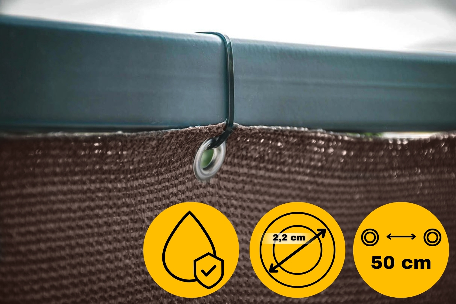 ⭕️ Aluminiowe oczka o zwiększonej odporności na rdzę, które zostały wszyte co 50 cm, zapewniają szybki i stabilny montaż osłony.