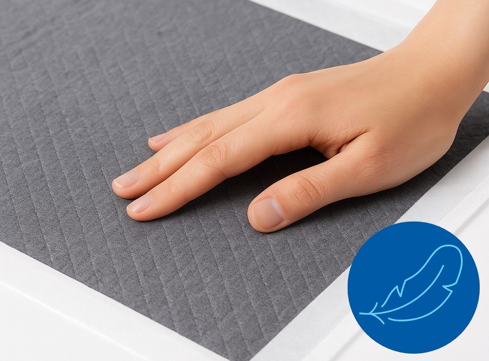 Nasze podkłady mają miękką i przyjemną w dotyku powierzchnię, która otula skórę i daje pełne poczucie komfortu. Są bezpieczne dla niemowląt, mam po porodzie, seniorów i wszystkich osób z wrażliwą skórą.