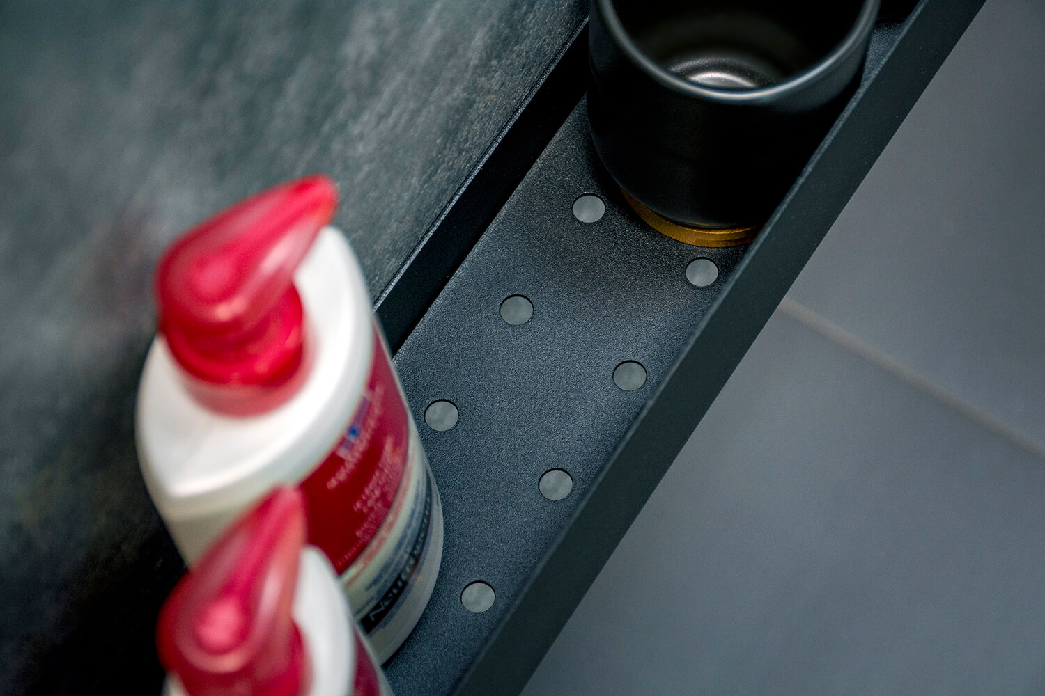 Dno półki zostało zaprojektowane z perforacją, która pozwala na swobodny odpływ wody. Dzięki temu unikniesz osadzania się kamienia i zalegającej wilgoci, co wpływa na dłuższą żywotność produktu i higieniczne warunki przechowywania kosmetyków.