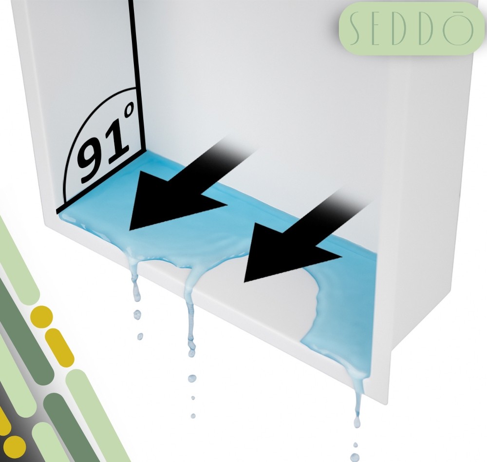 Ścianki półki mają subtelne nachylenie (91°), które umożliwia swobodny spływ wody. Dzięki temu nie gromadzi się wilgoć ani osady, a półka pozostaje higieniczna, sucha i łatwa w utrzymaniu w czystości.