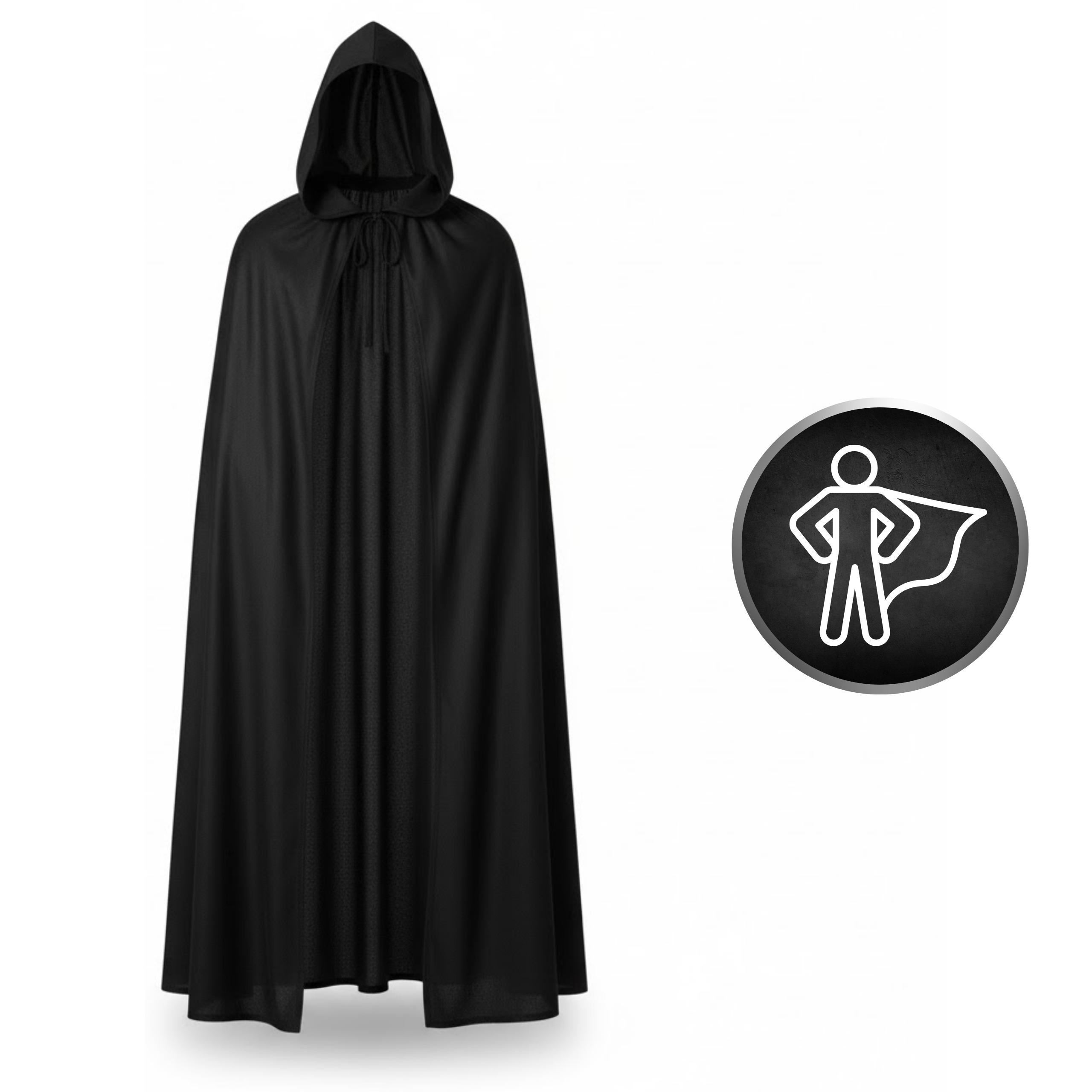 Peleryna wiązana jest z przodu przy szyi, co pozwala dopasować ją do różnych sylwetek. Kaptur zapewnia dodatkowy efekt wizualny oraz komfort podczas noszenia. Maska na oczy mocowana na materiałowe wiązanie z tyłu głowy nie uciska i dobrze się trzyma.