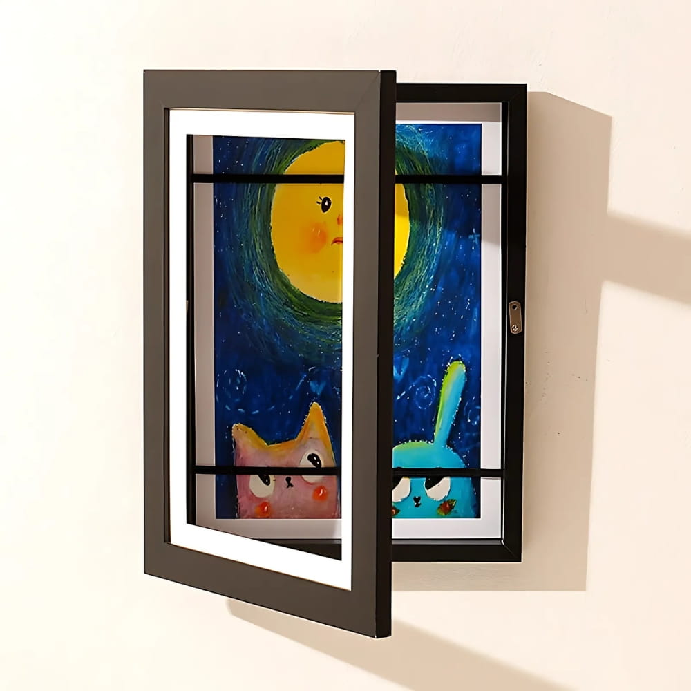Nie musisz zdejmować ramki ze ściany, aby zmienić rysunek – wystarczy otworzyć front, włożyć nową pracę i zamknąć ramkę.