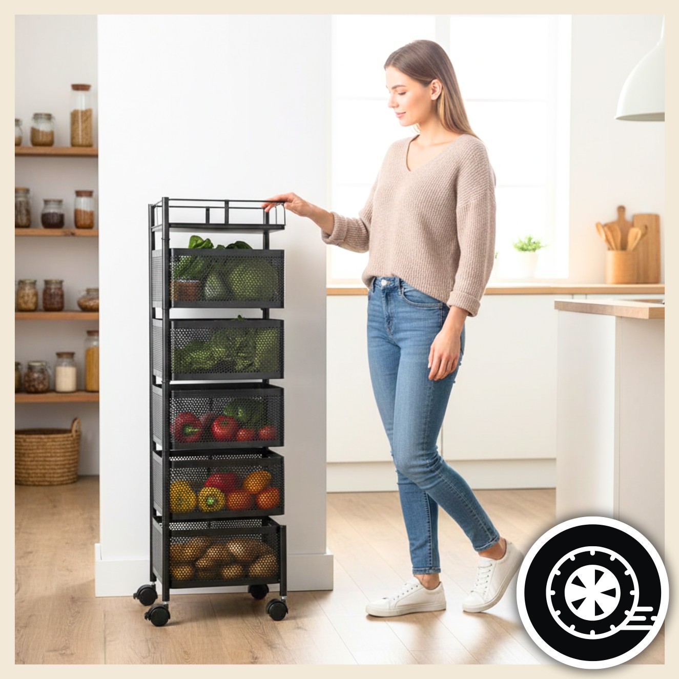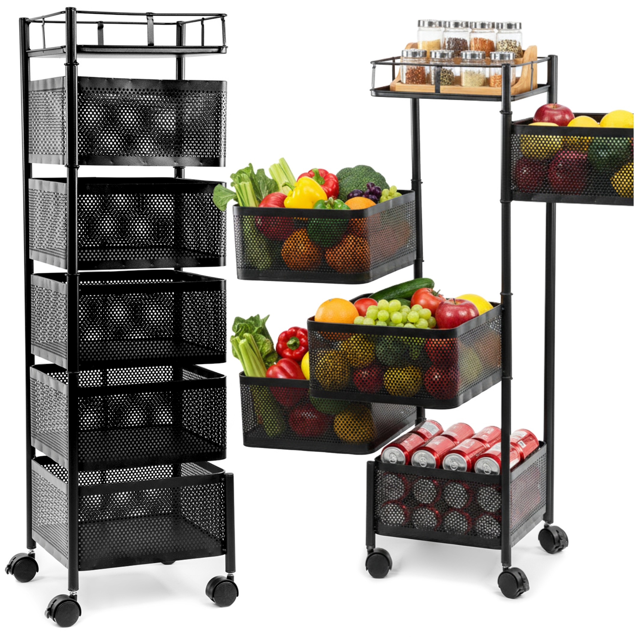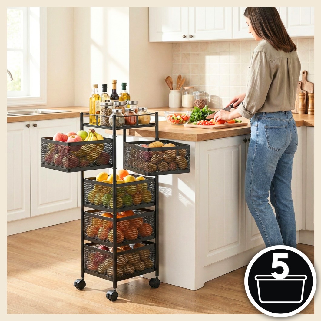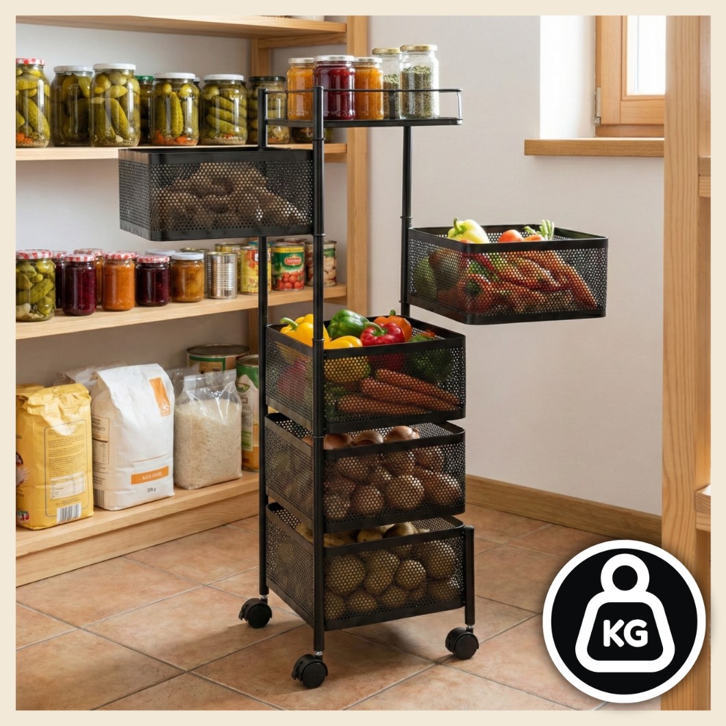 Mobilny regał do kuchni wyposażony jest w 5 identycznych koszy, o udźwigu do 10 kg. Ażurowa konstrukcja ścianek umożliwia przechowywanie produktów świeżych w sposób stabilny i bezpieczny. Każda półka to osobny, modułowy, wysuwany kosz, w którym zmieszczą się: