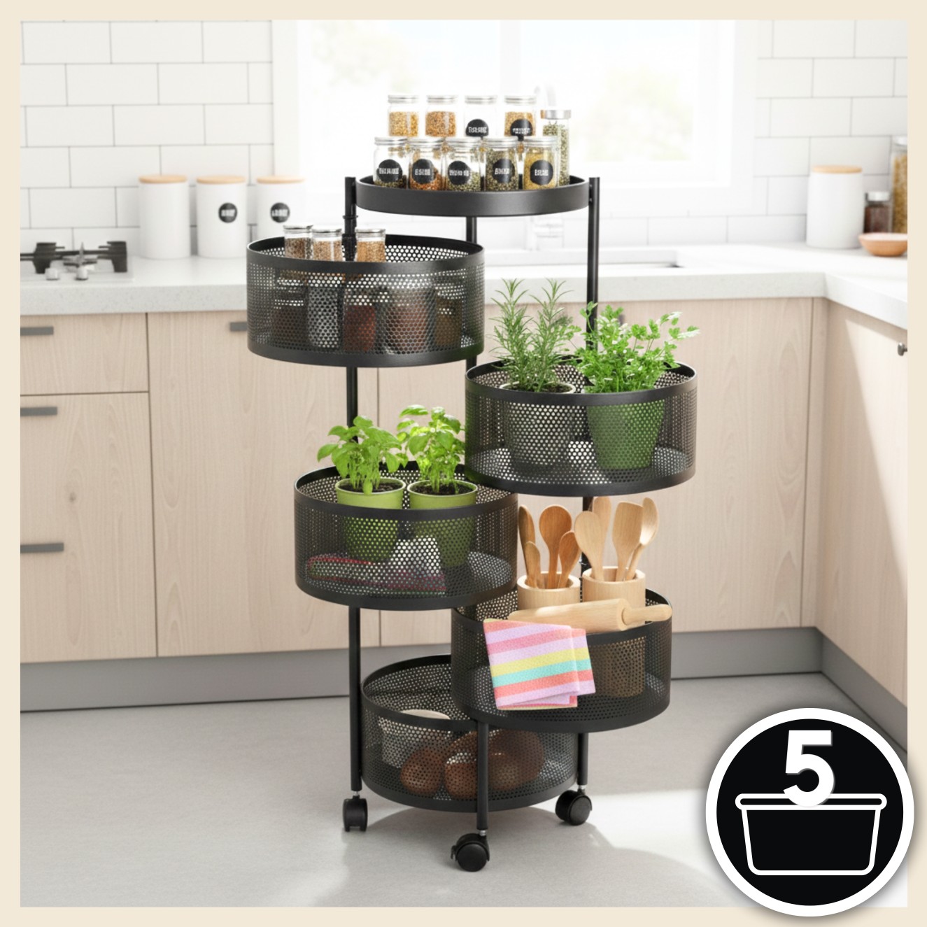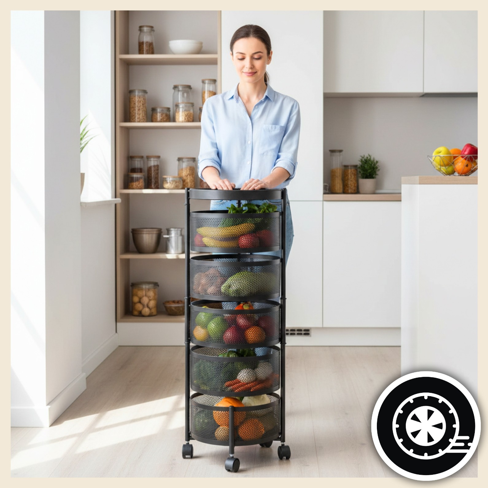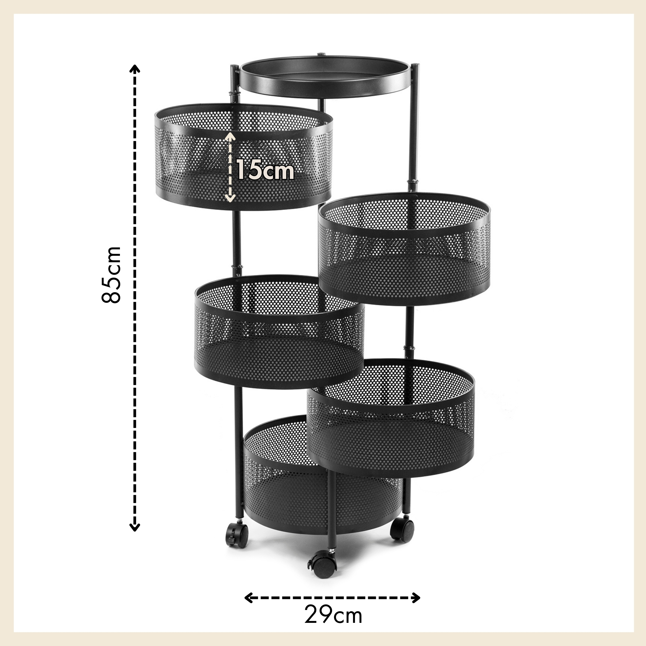 Wózek składa się z solidnej ramy oraz pięciu okrągłych, obrotowych półek, z których każda wytrzymuje obciążenie do 10 kg. Ażurowe ścianki sprzyjają przechowywaniu świeżych produktów i zapewniają im odpowiednią wentylację. Wysuwane kosze gwarantują wygodny dostęp do zawartości. Na półkach zmieścisz m.in.: