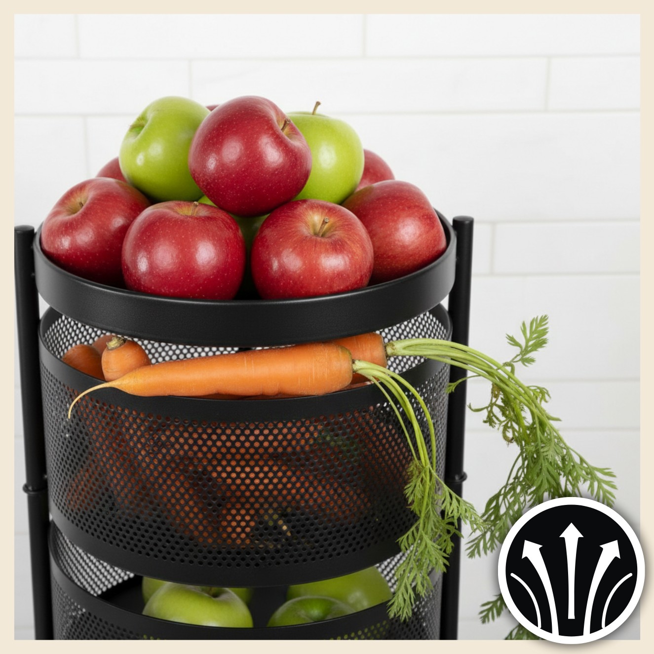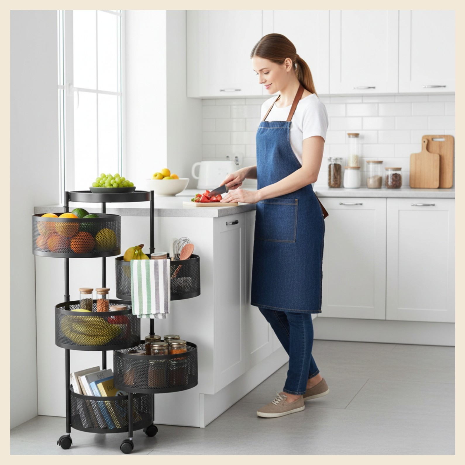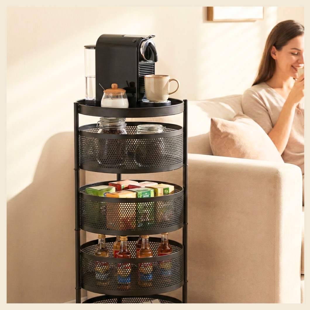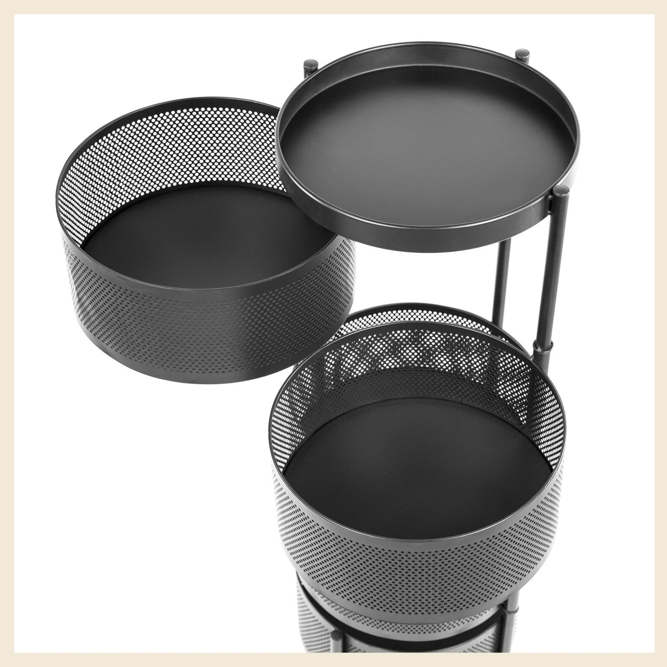 Wózek składa się z solidnej ramy oraz pięciu okrągłych, obrotowych półek, z których każda wytrzymuje obciążenie do 10 kg. Ażurowe ścianki sprzyjają przechowywaniu świeżych produktów i zapewniają im odpowiednią wentylację. Wysuwane kosze gwarantują wygodny dostęp do zawartości. Na półkach zmieścisz m.in.: