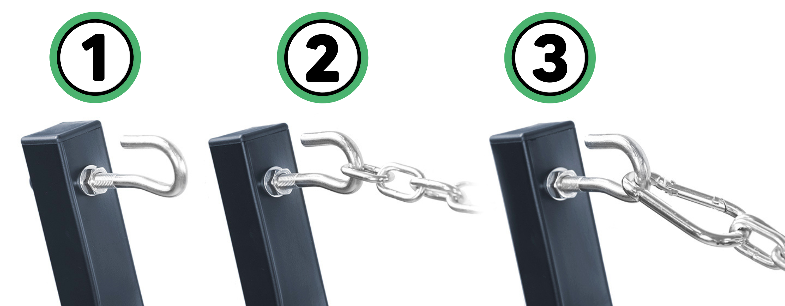 ➡️ Na haku, łańcuchu i karabińczyku – dla krótszych hamaków.